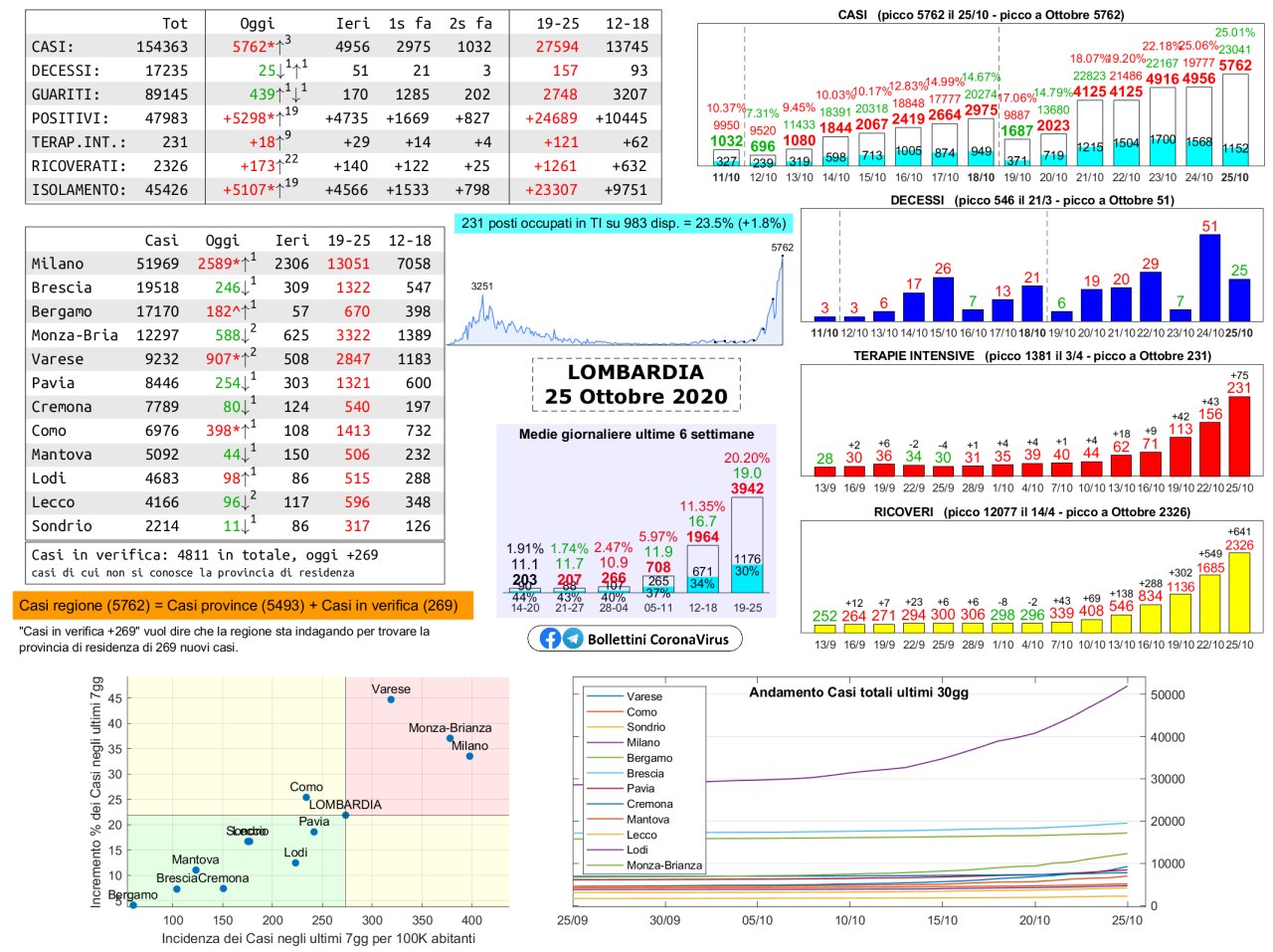 5.762 nuovi contagi, altri 25 decessi, +18 ingressi nelle terapie intensive e +173 negli altri reparti. Questo il bollettino di oggi con i dati diramati dalla Regione sull’epidemia di coronavirus in Lombardia.