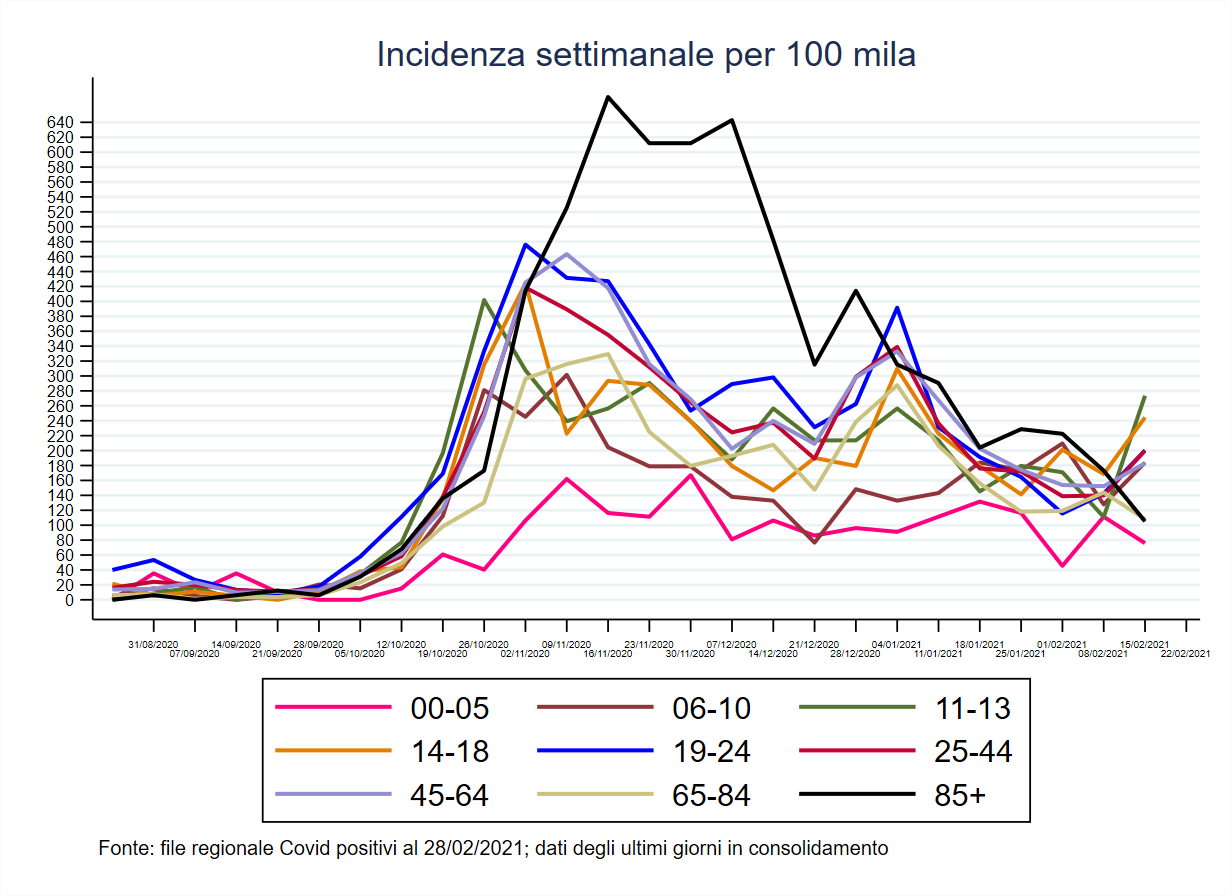 Il grafico sotto riportato mostra infatti che la seconda ondata ha impattato soprattutto sulla parte più anziana della popolazione mantovana (almeno fino all’inizio delle vaccinazioni nelle RSA), mentre le curve dei nuovi casi nelle altre fasce d’età sono praticamente sovrapposte, con i più piccoli colpiti in misura minore rispetto agli altri. Tutto ciò a riprova che la scuola riflette il contesto cui appartiene piuttosto che amplificare la diffusione epidemica, per altro in coerenza con quanto già osservato in altri Paesi europei che hanno adottato politiche meno restrittive su questo comparto.