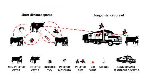 Il virus si diffonde principalmente attraverso insetti che si nutrono di sangue, come mosche, zanzare, zecche e culicoidi. È fondamentale sottolineare che questa malattia non colpisce l’uomo, ma interessa esclusivamente gli animali. Non è quindi una zoonosi e l’uomo non può essere contagiato, né direttamente né attraverso il consumo di carne o latte.