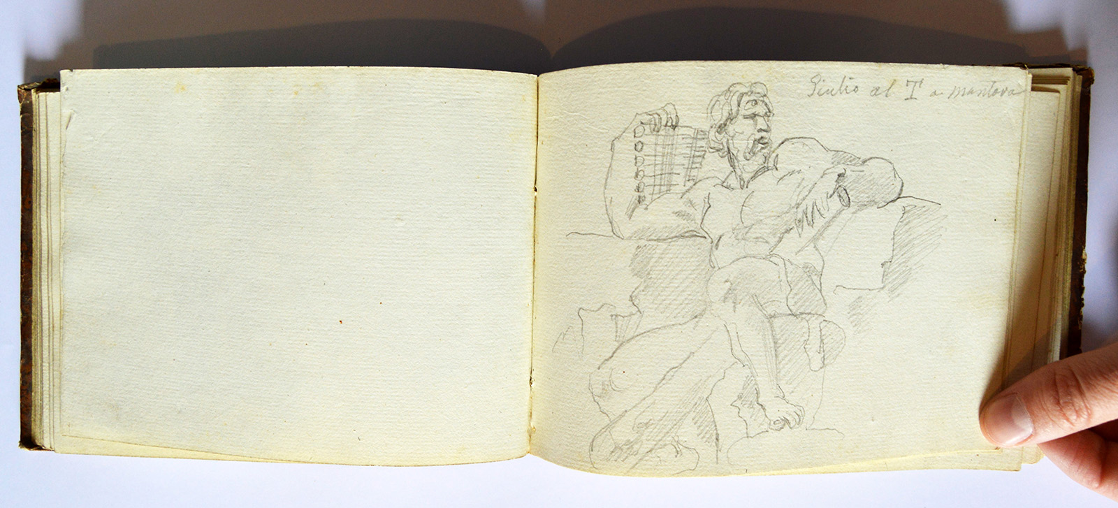 «Desidero non solo esprimere gratitudine alla donatrice di questo bel taccuino – afferma il Direttore di Palazzo Ducale Stefano L’Occaso – ma anche richiamare interesse su questa serie di disegni, che includono monumenti medioevali veronesi, dipinti del Rinascimento veneziano, opere del Guercino, ma anche la chiesa albertiana di Sant’Andrea e alcuni affreschi di Palazzo Te, che l’ignoto artista ebbe modo di apprezzare. Si tratta, io credo, di un pittore dell’Italia del nord, probabilmente un veneto, che già partecipa dello spirito romantico e che si dimostra anche abile ritrattista. Alcune annotazioni a matita potrebbero suggerire che l’autore dei disegni sia Placido Fabris (Pieve d’Alpago, 26 agosto 1802 – Venezia, 7 dicembre 1859), un pittore a lungo attivo a Venezia ma anche a Milano; questa ipotesi porterebbe a datare il taccuino entro il 1838».