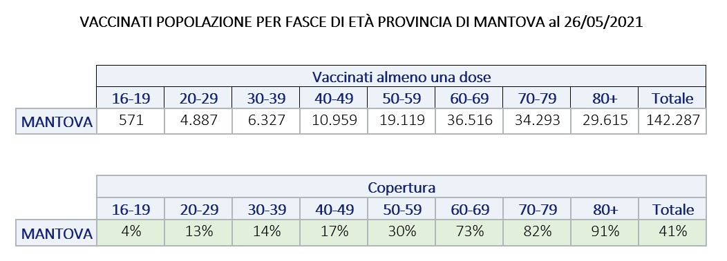 Vaccinazioni anti Covid erogate dalla ASST di Mantova al 26 maggio 2021 sono 164.524, di cui: