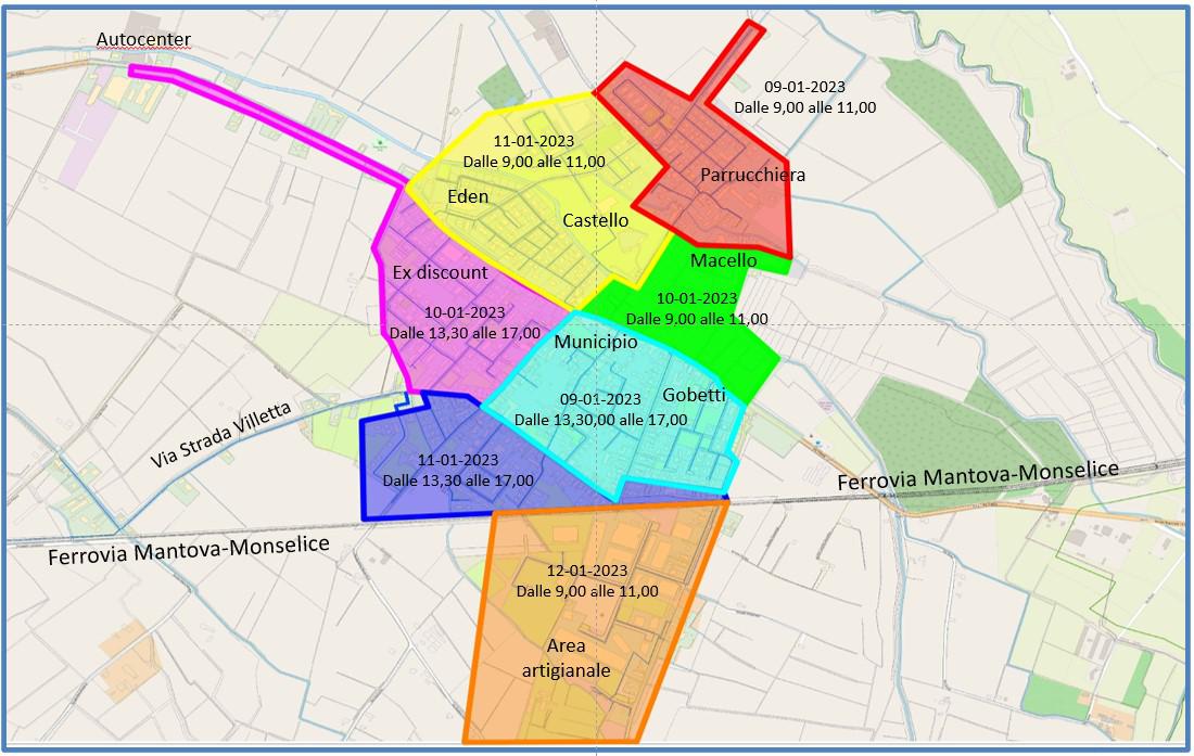3. area lilla (zona via Mazzolari): 21 febbraio dalle ore 8,30 alle ore 19,00, lavaggio diurno rete