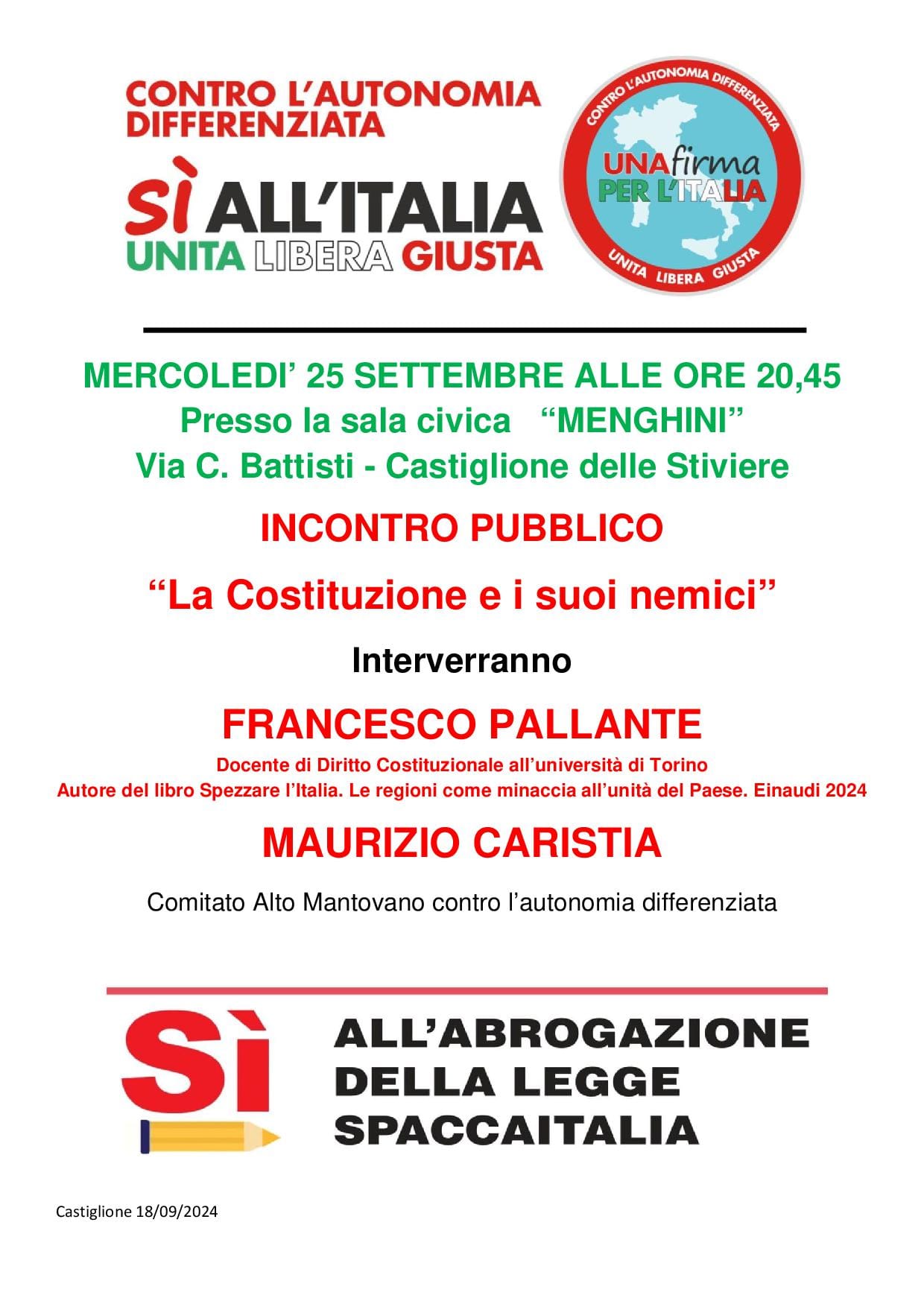 CASTIGLIONE DELLE STIVIERE – Ultimo incontro organizzato dal Comitato Alto Mantovano contro l’autonomia differenziata. L’appuntamento è per mercoledì 25 settembre alle 20.45 presso la sala civica “Menghini” in via Cesare Battisti.