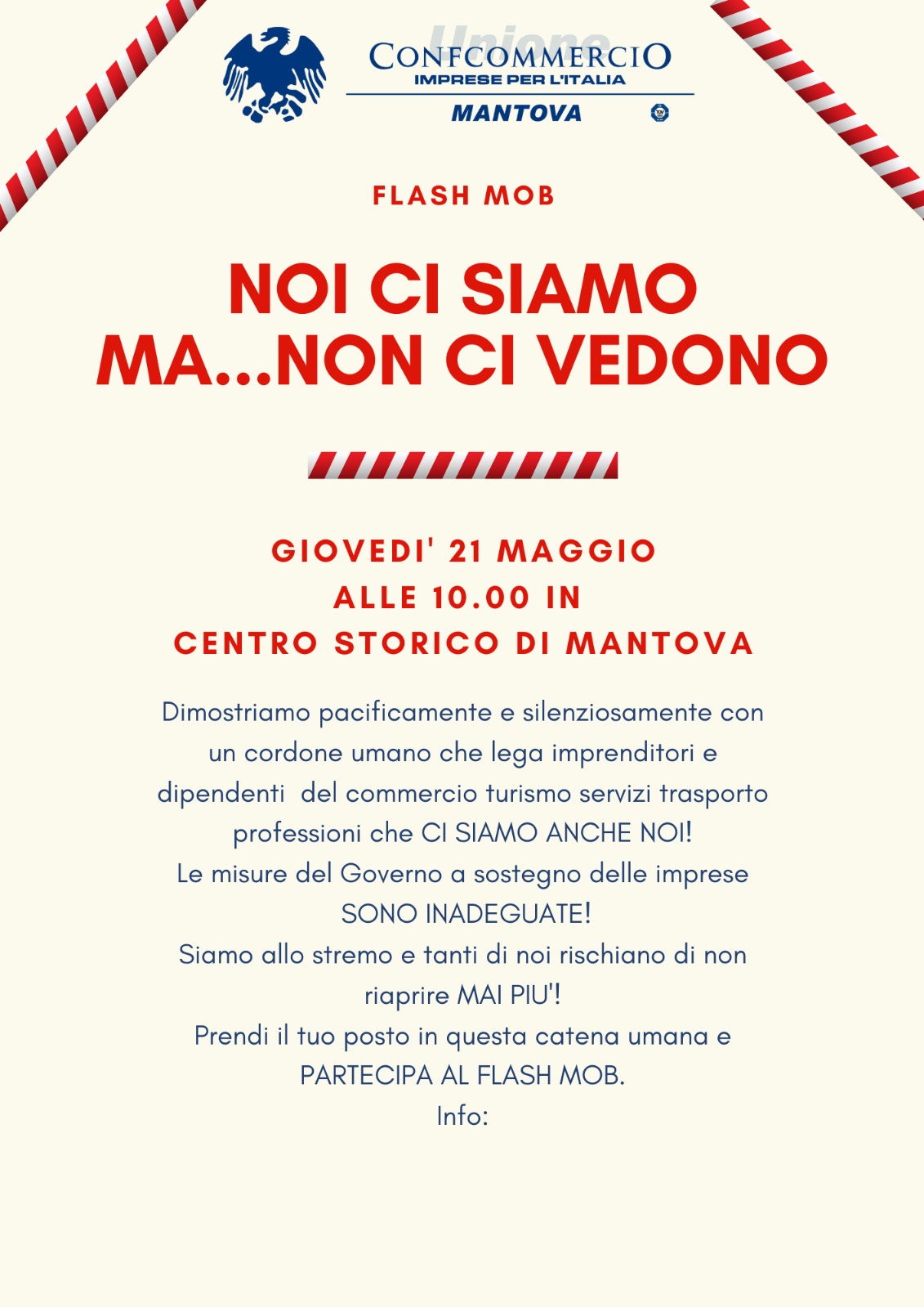 MANTOVA – “Noi ci siamo ma….non ci vedono”. E’ lo slogan del lungo cordone umano formato da commercianti, artigiani, professionisti e dipendenti del turismo, dei servizi e dei trasporti che giovedì mattina si snoderà a Mantova per le vie del centro storico. Un cordone organizzato nel massimo rispetto delle distanze di sicurezza dove i partecipanti saranno in contatto tra loro tenendo in mano delle strisce di plastica bianche e rosse, come quelle che si usano per delimitare le aree, di un metro e mezzo di lunghezza ciascuna. In questo modo tra un partecipante e l’altro sarà garantito il distanziamento.