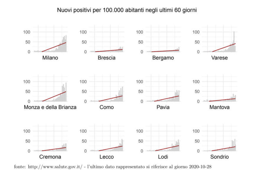 Si può notare nelle tre tabelle relative ai nuovi positivi ogni 100 mila abitanti negli ultimi 14, 28 e 60 giorni come quella mantovana sia una delle province con gli incrementi più contenuti, con dati e relative inclinazioni dei tracciati appena al di sopra di quelli di Brescia e Bergamo che rimangono sempre le province con gli incrementi più bassi della seconda ondata di contagi.