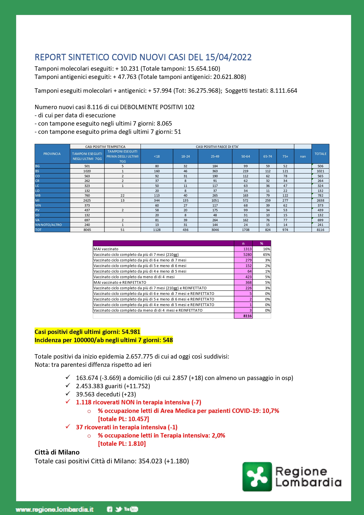 MILANO – Sono 8.098 i nuovi positivi in Lombardia su 57.994 tamponi effettuati per una percentuale del 13,9%. Continuano a diminuire i ricoverati in terapia intensiva (-1) e nei reparti (-7).