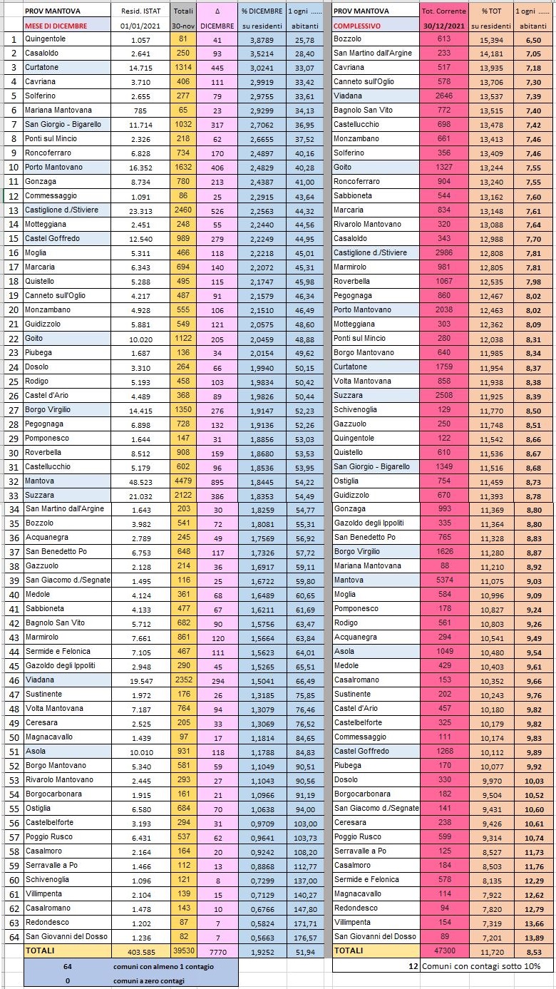 Complessivamente l’11,7% dei mantovani è stato contagiato (clicca sulla tabella sotto per ingrandire)
