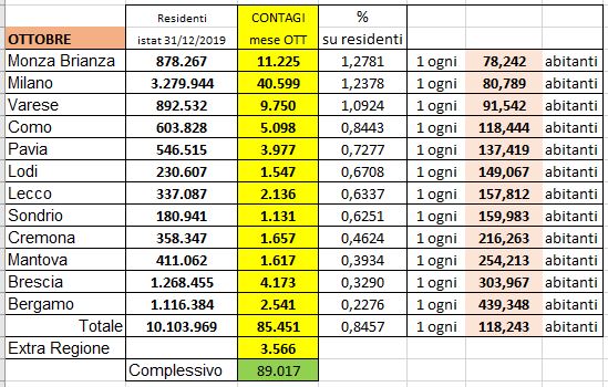 Al contrario la provincia con la maggior incidenza di nuovi contagi è quella di Monza Brianza con un positivo a ottobre ogni 78 residenti, seguita da Milano con uno ogni quasi 81 abitanti. Terzo posto per Varese: uno ogni 91,5 abitanti.