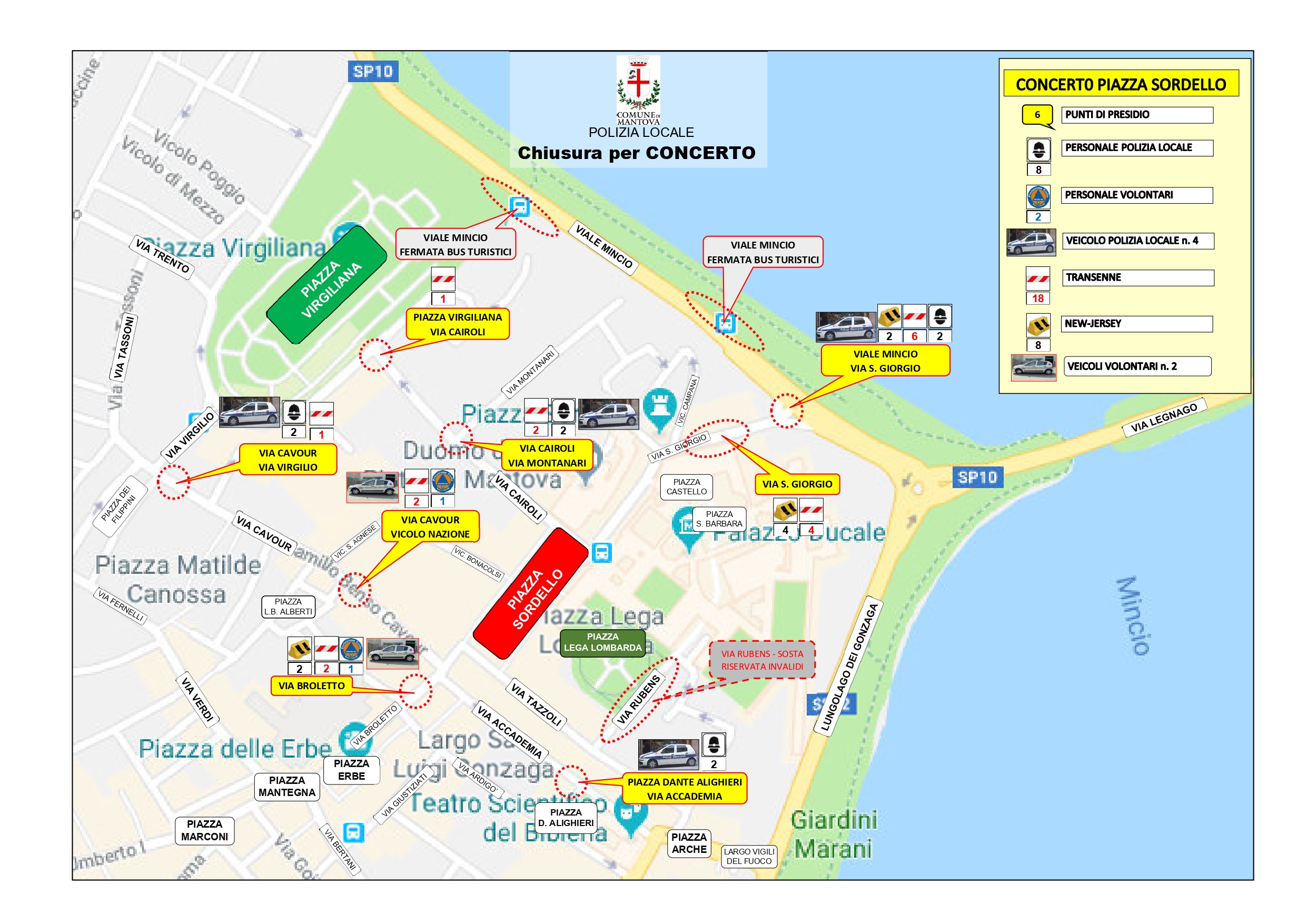 MANTOVA – Domani dalle 19 fino alla conclusione dello spettacolo musicale (alle 2 circa), è prevista la chiusura al traffico nelle seguenti vie e piazze: via San Giorgio, piazza Sordello, piazza Seminario, via Tazzoli, via Accademia (tra piazza Dante Alighieri e via Broletto), via Cavour (tra via Broletto e vicolo Nazione), via Sant’Agnese, vicolo Bonacolsi e l’imbocco dei giardini della “Passeggiata Maria Teresa d’Austria” del Lungolago dei Gonzaga.