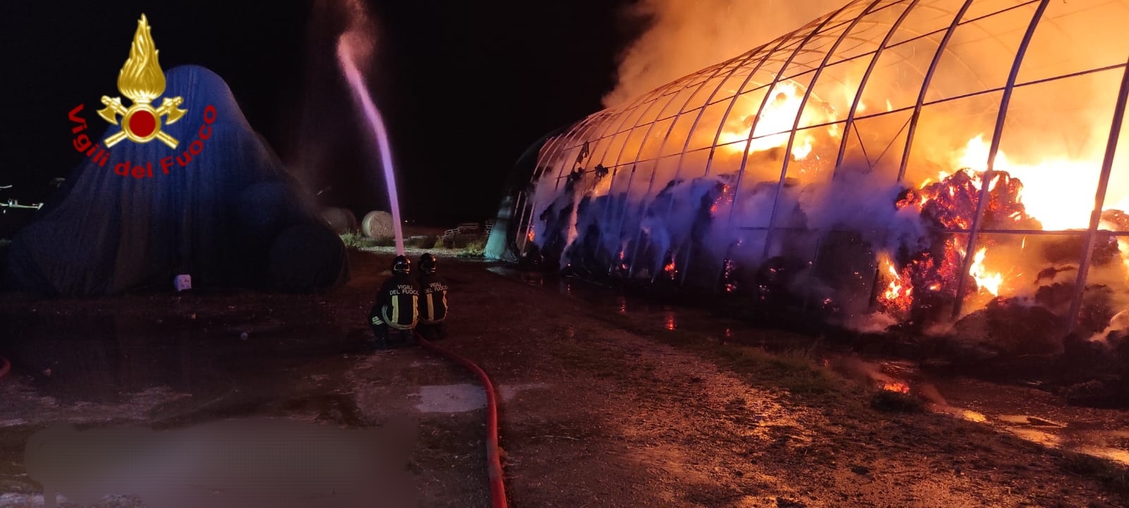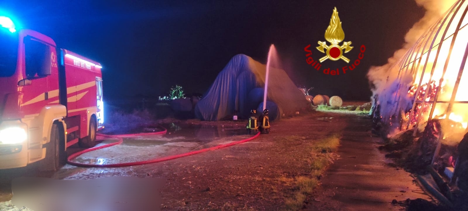 Le fiamme sono divampate in una tensostruttura adibita e fienile che era piena di rotoballe e si sono sviluppate molto velocemente.