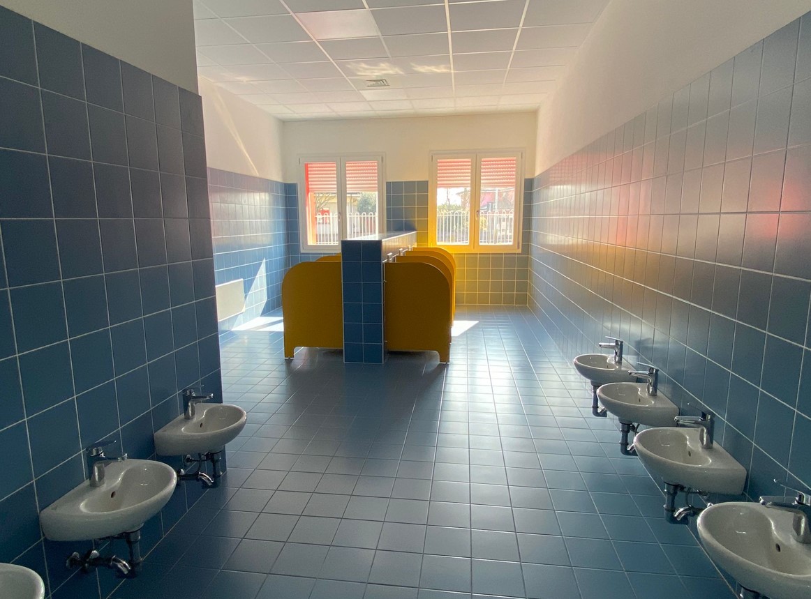 Il plesso si estende su una superficie di 1.090 mq, mentre la parte interna è di 859 mt. Ogni area ha due blocchi, con aule e servizi, più il salone con aule che hanno funzione di sali polivalenti e grazie ad una apertura possono diventare uno spazio unico in base alle esigenze. A corredo degli spazi interni c’è un ampio spazio esterno.