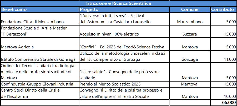 - Istruzione e Ricerca scientifica: 7 progetti per 66.000 euro;