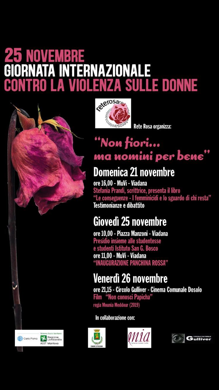 VIADANA – Si intitola “Non fiori… ma uomini per bene” il trittico di appuntamenti organizzati da Rete Rosa con il patrocinio del Comune di Viadana e in collaborazione con Asst “Carlo Poma” Mantova, Mia e Circolo Culturale Gulliver di Dosolo in occasione della giornata internazionale contro la violenza sulle donne in programma giovedì 25 novembre.