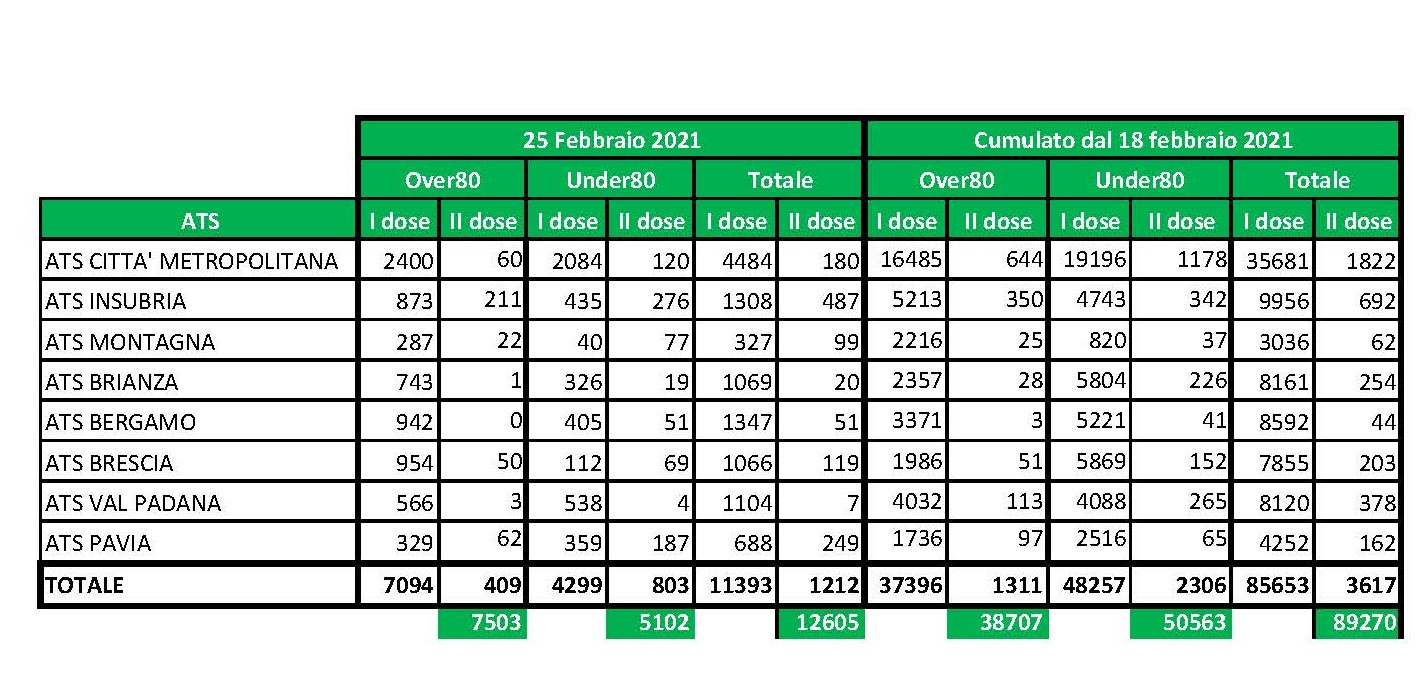 MILANO – Nella giornata di ieri, giovedì 25 febbraio, hanno ricevuto la prima dose di vaccino anti-Covid (fase ‘1 ter’) 7.094 anziani a cui si aggiungono i 409 che hanno ricevuto la seconda dose di vaccino, per un totale di 7.503 dosi somministrate agli over 80. Dall’inizio della campagna over 80 del 18 febbraio, sono state somministrate complessivamente a questa categoria di cittadini 38.707 dosi.