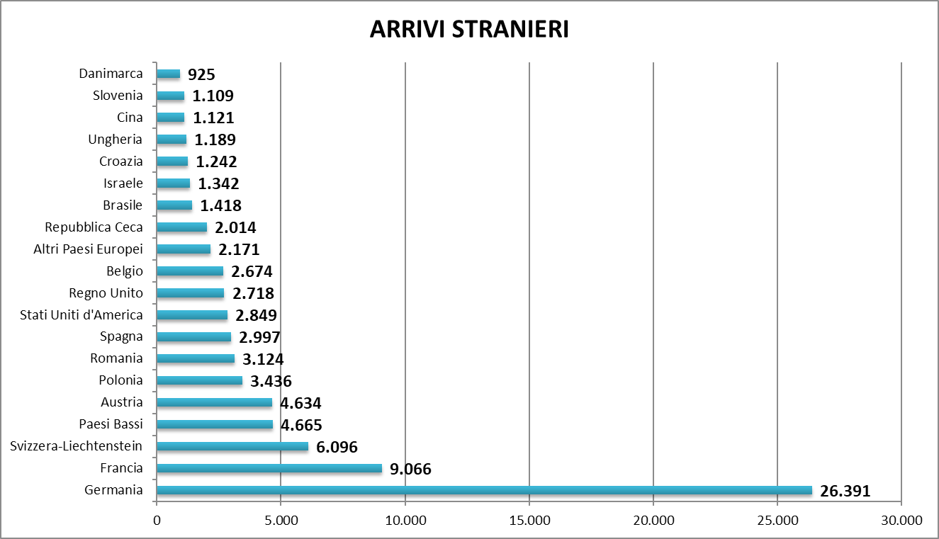 Si mantiene in seconda posizione la Francia con il 9,6% di Arrivi, seguita da Svizzera-Liechtenstein ( 6,46%), Paesi Bassi (4,94%) e Austria (4,91%).