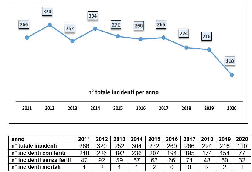 Nell’anno 2020, la fascia oraria 16.00-18.00 è stata quella con il più elevato valore di incidentalità, seguita dalla fascia oraria 11,00-13,00.