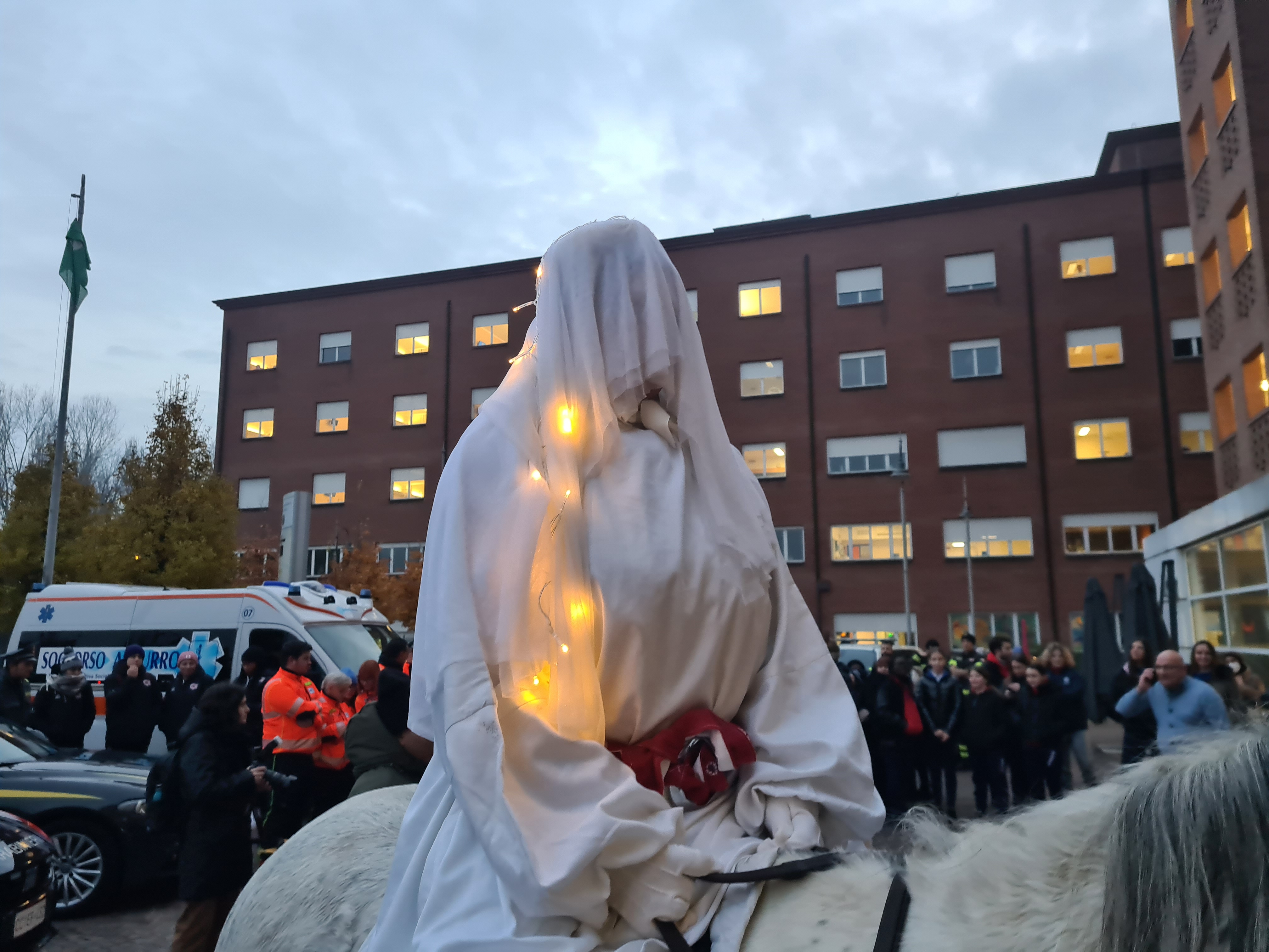 Santa Lucia è arrivata in sella a un cavallo, seguita da un asinello che trainava il carretto dei regali. Ad accoglierla le forze dell’ordine che hanno fatto partire le sirene. Poi un piccolo intrattenimento musicale che ha accompagnato la donazione dei regali raccolti dal personale della pediatria del Carlo Poma, che li hanno poi portato ai bambini. A seguire un piccolo corteo si è spostato sul retro della pediatria dove un gruppo di bambini, dalla vetrata ha potuto vedere da vicino Santa Lucia.
