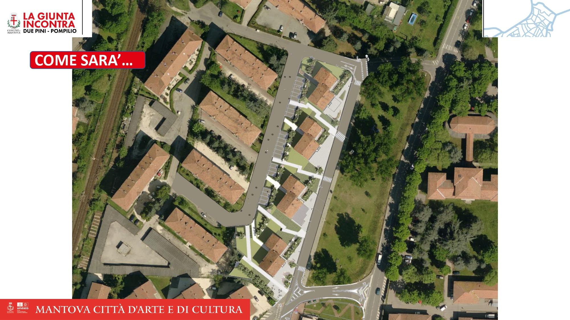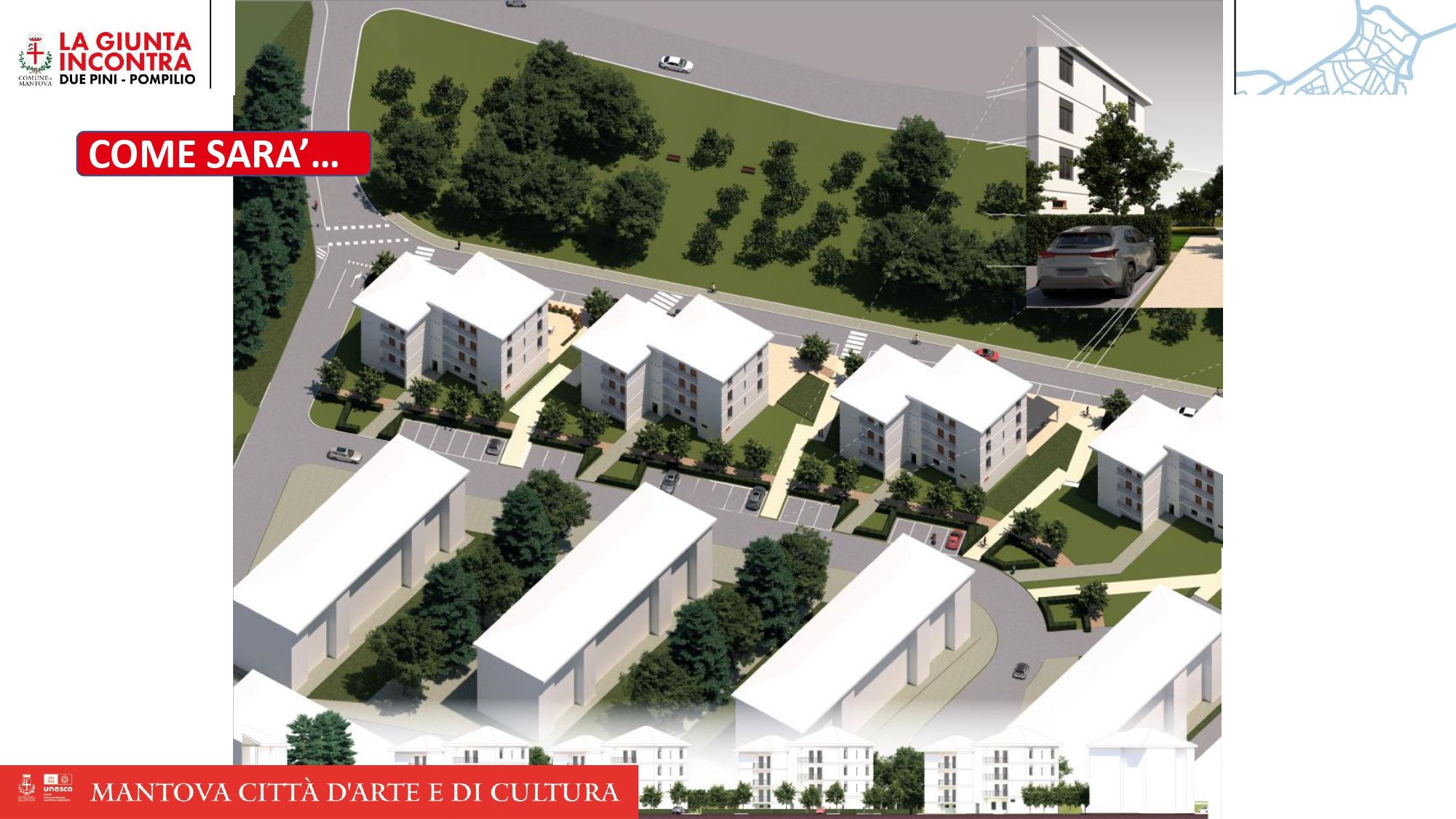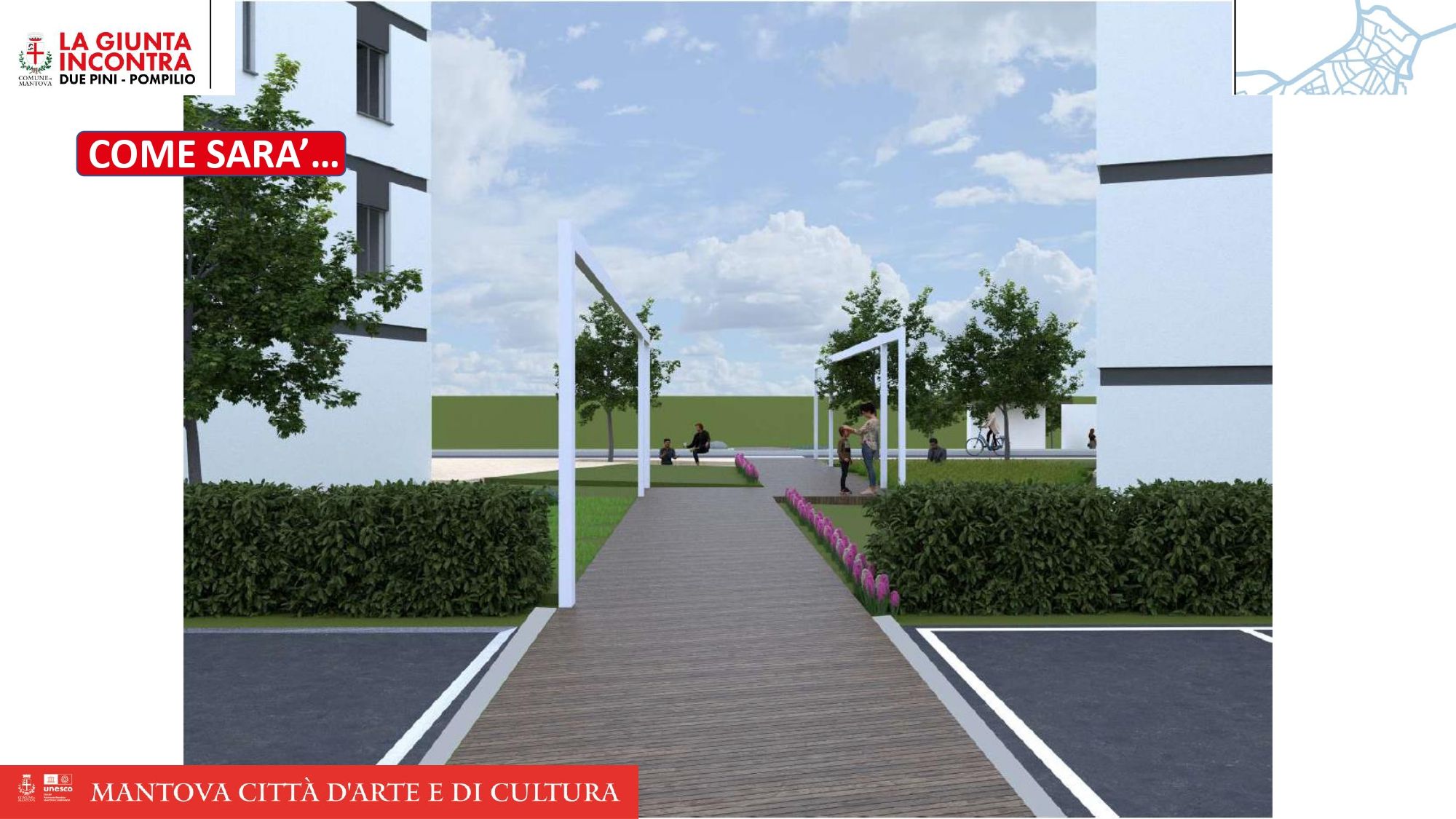 In primis la riqualificazione degli spazi comuni nel quartiere Erp di Due Pini. Il progetto prevede un investimento complessivo di 600mila euro e si inserisce nel più ampio programma di interventi finanziati dal bando Pinqua – Programma innovativo nazionale per la Qualità dell’Abitare finanziato dal Ministero delle Infrastrutture e della Mobilità sostenibili. Le tempistiche prevedono l’inizio dei lavori in aprile e avranno una durata di circa sette mesi. “Dopo sessant’anni i residenti nel quartiere Due Pini – ha detto Martinelli – non dovranno più convivere con sterrati e strade dissestate. La zona attualmente in degrado interessata dai lavori è di proprietà dell’ente regionale Aler, così come i condomini presenti tra via Val d’Ossola e viale Bolivia, ma grazie a degli accordi ora il Comune di Mantova interverrà per riqualificare tale lotto del quartiere. L’intervento, in sintesi, vedrà la realizzazione di quattro piazze pedonali affacciate su via Val d’Ossola pavimentate in pietra di Luserna, il recupero del verde che circonda gli edifici con alberi ad alto fusto, aiuole e sistema d’irrigazione e percorsi in pietra a collegare le due arterie. Inoltre, il raddrizzamento della sede stradale di via Bolivia con il recupero di spazi per parcheggi ordinati, con oltre 20 posti auto, e un nuovo impianto d’illuminazione a led dedicato per ogni zona”. Verrà rifatta nell’area anche la rete del gas. Questo progetto di recupero riguarda un primo lotto, dato che vi sono i fondi per tali lavori, ma sono previsti altri due lotti per ulteriori interventi di recupero del quartiere di Due Pini. Previste anche aree ordinate di raccolta dei rifiuti.