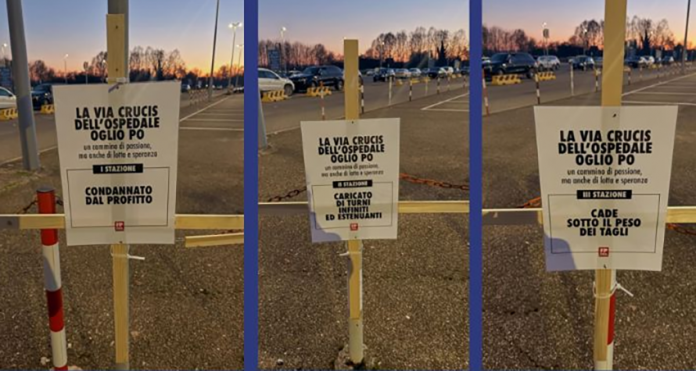 Una protesta simbolica ma di forte impatto quella messa in scena dalla Cgil Funzione Pubblica di Cremona nel parcheggio del personale dell’ospedale Oglio Po. Nella serata di venerdì il sindacato ha installato quattordici cartelli, ciascuno dedicato a un disservizio o a un problema che, secondo la sigla sindacale, affligge da tempo la struttura di Casalmaggiore. I pannelli, ben visibili sia ai dipendenti sia ai cittadini che accedono all’ospedale per cure o per far visita ai familiari, sono stati definiti dalla Cgil come una sorta di “Via Crucis laica”, pensata per raccontare “la sofferenza e la resistenza del nostro ospedale”.