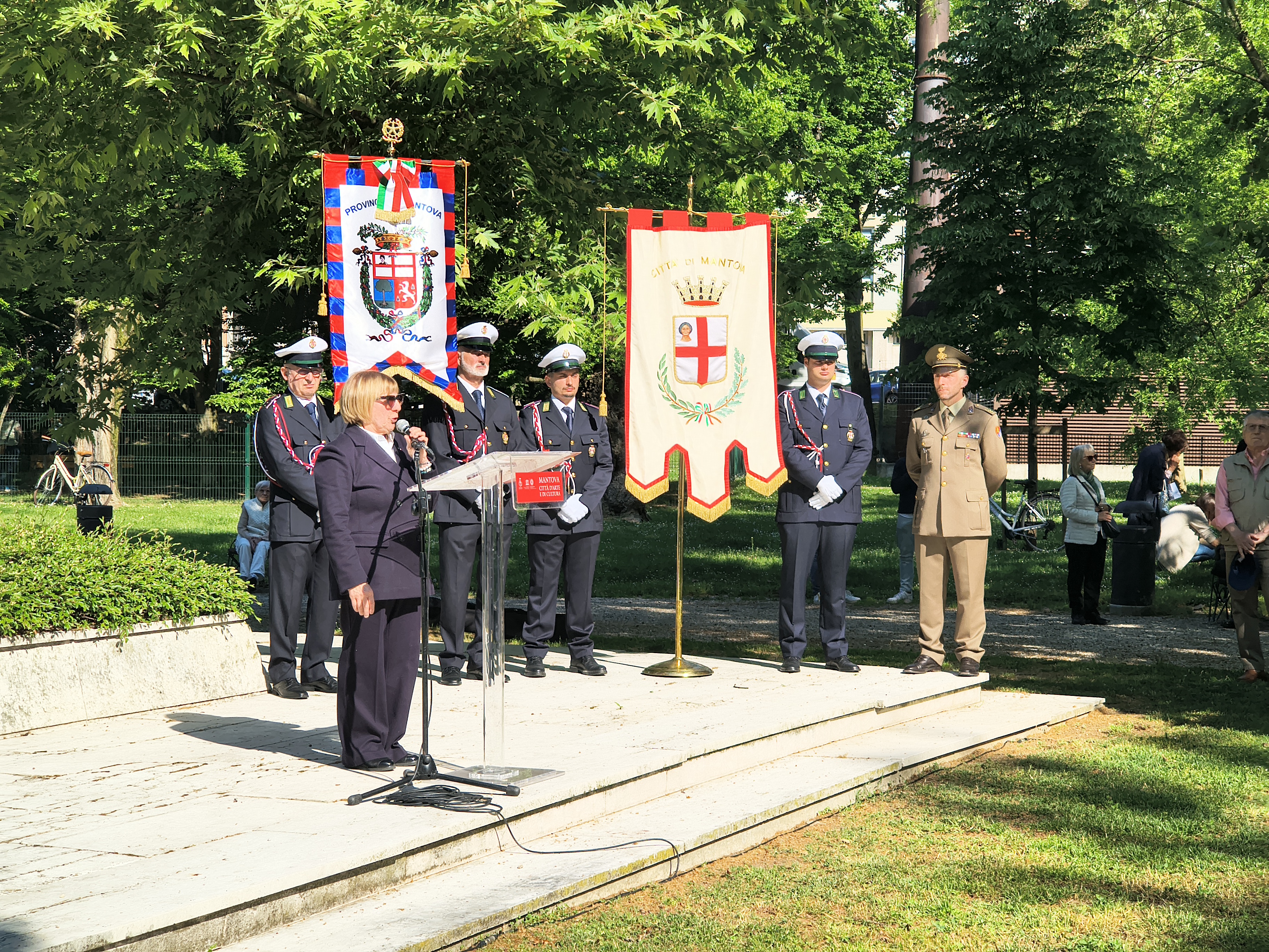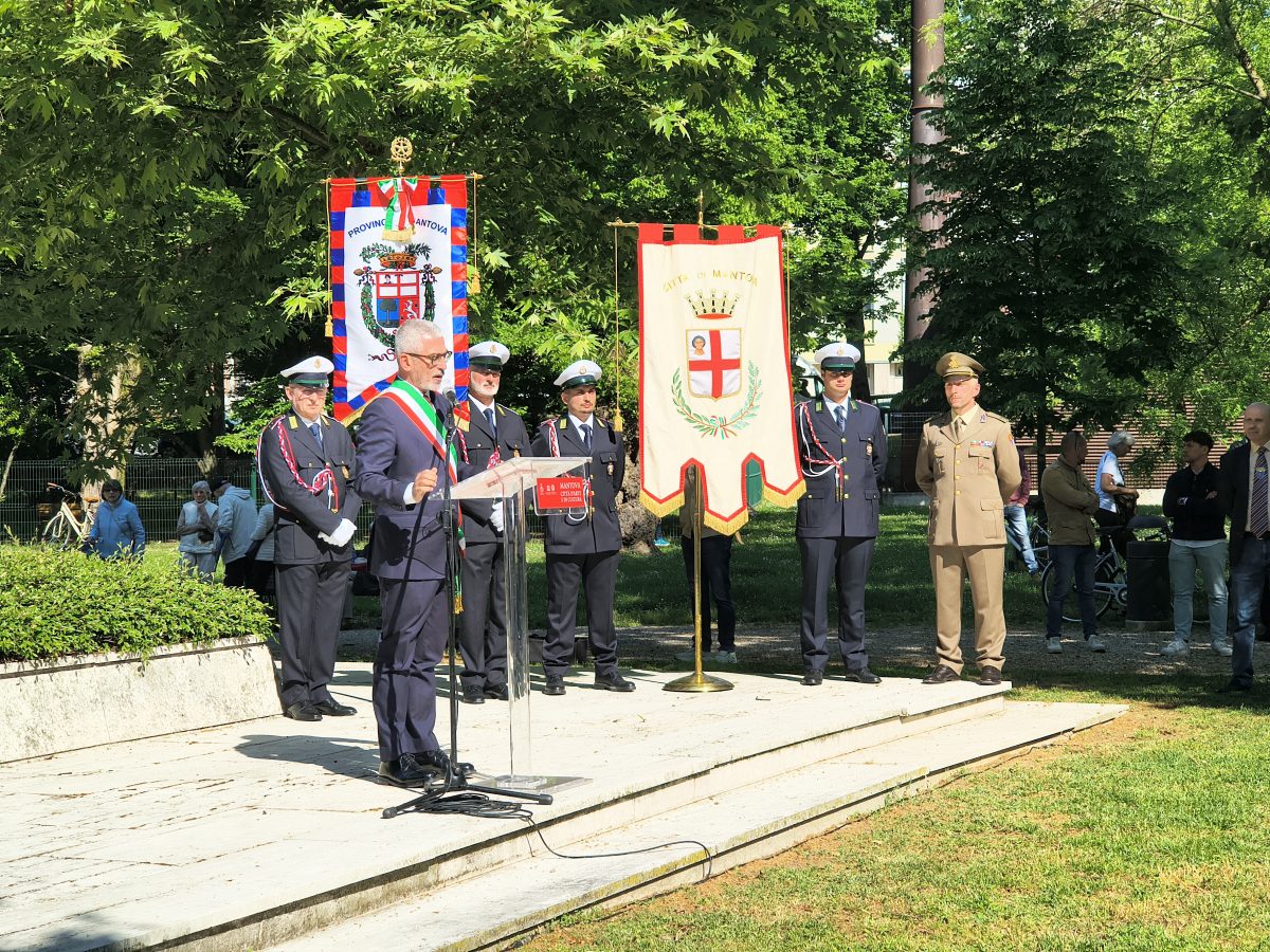 Poi il riferimento alle manifestazioni fasciste che vengono organizzate nelle città, Mantova compresa e, dopo un excursus sulla storia della resistenza mantovana, il paragone tra i partigiani e gli eroi del Risorgimento. “Molti hanno tentato di ridurre la Resistenza a un’esperienza storica di passaggio, precaria, ininfluente. Nel gennaio di quest’anno è scomparsa Lina Stuani, che fu una delle testimoni dell’eccidio dell’Aldriga. Qui vennero fucilati dai nazifascisti dieci soldati presi a caso tra i prigionieri che avevano tentato di difendere il nostro Paese dall’oltraggio straniero. Lina vide e nella sua vita continuò a raccontare ciò che vide. Lina silenziosamente ci ha affidato un compito: man mano che i testimoni di quell’epoca tragica e gloriosa vengono a mancare, noi dobbiamo preservarne la memoria, noi dobbiamo ricordare l’umanità calpestata, offesa, avvilita ma non doma. Lo scorso anno ho parlato degli atti di resistenza condotti da un gruppo di giovani che si raccoglievano attorno alla figura di don Primo Mazzolari, l’esempio di don Costante Berselli, gli eventi di Villa Gobia e l’omicidio a colpi di pistola di un altro sacerdote, don Eugenio Leoni, che aveva deciso di non rivelare ciò che sapeva per coprire e difendere la resistenza. Voglio oggi ricordare Giuseppina Rippa, una ragazza del popolo, giustiziata a 28 anni senza alcun processo l’11 settembre del 1943, mentre cercava di alleviare la fame e la sete di alcuni soldati italiani stipati sotto il sole nei camion, senza possibilità di mangiare e di bere prima della deportazione nei campi di lavoro tedeschi. Questo accadde nella nostra città, l’armistizio era stato pubblicato soltanto tre giorni prima e la furia nazista si accaniva contro i nostri militari e civili. Giuseppina non aveva compiuto quel gesto in base a un disegno politico o a un’appartenenza, non intendeva manifestare una propria radicale protesta: aveva portato pane e acqua, semplicemente per amore della vita e della dignità umana. Ancora oggi, anche nella nostra città e provincia, assistiamo a manifestazioni negazioniste e a esponenti che parlano di “invenzione dell’antifascismo”. Chi lo fa offende in modo vile e volgare il sacrificio di queste donne e uomini, vite sacrificate per noi, per la libertà e la dignità di ciascuno di noi. Anche per la libertà di chi nega questo sacrificio stesso”.