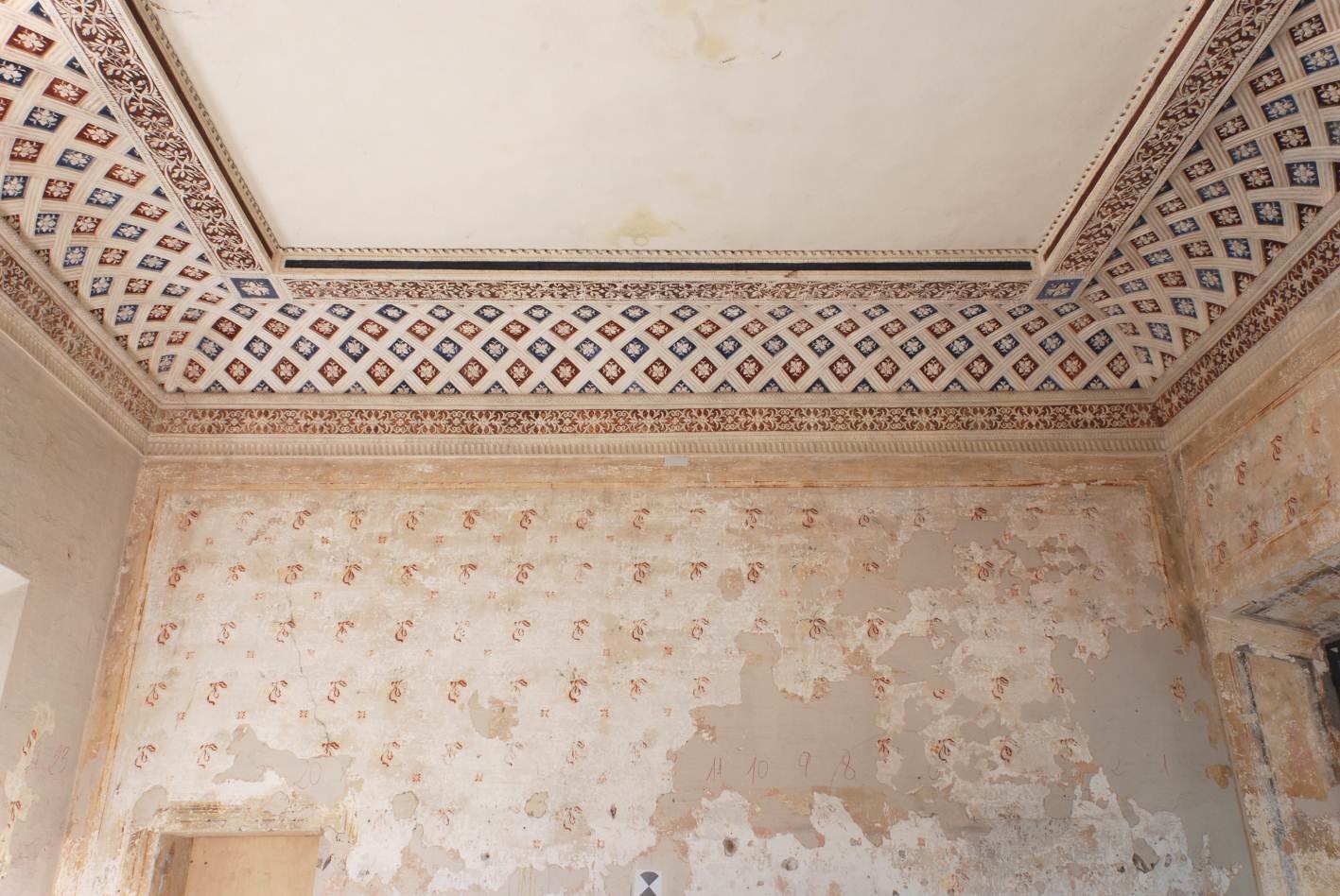 Nello specifico si procederà sugli intonaci, per riportare alla luce gli ornati sottostanti gli scialbi monocromi, operando con un accurato descialbo, ovvero rimozione dell’intonaco più recente, e un efficace consolidamento in profondità a mezzo di iniezioni di miscele a base di calce idraulica naturale. Le pareti intonacate della Camera grande e del Camerino degli uccelli presentano più strati di finiture a tempera e a calce, mettendo in luce un motivo decorativo a stencil ottocentesco. L’intonaco attualmente presenta significativi distacchi, rilevabili anche da terra, stuccature cementizie, lacune e fratture.