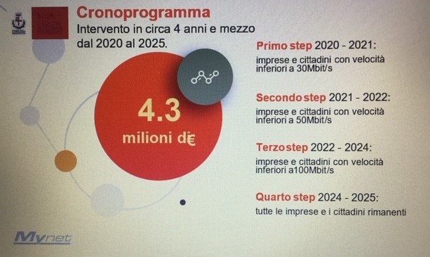Il cronoprogramma prevede 4 fasi di sviluppo. La prima partirà entro la fine del 2020 e riguarderà imprese e cittadini che oggi hanno un accesso alla rete con velocità inferiori a 30Mbit/s.