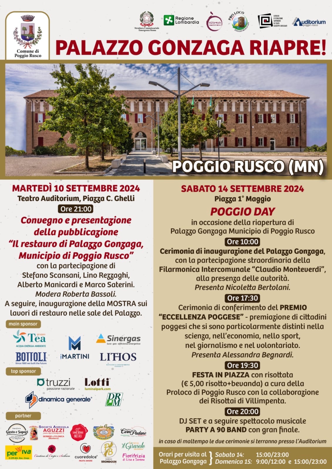 Ecco allora il convegno e presentazione del 10 settembre al Teatro Auditorium di piazza Ghelli “Il restauro di Palazzo Gonzaga, Municipio di Poggio Rusco” con la partecipazione di Stefano Scansani, Lino Rezzaghi, Alberto Manicardi e Marco Saterini. Moderatore Roberta Bassoli. A seguire inaugurazione delle mostra sui lavori di restauro delle sale del Palazzo.