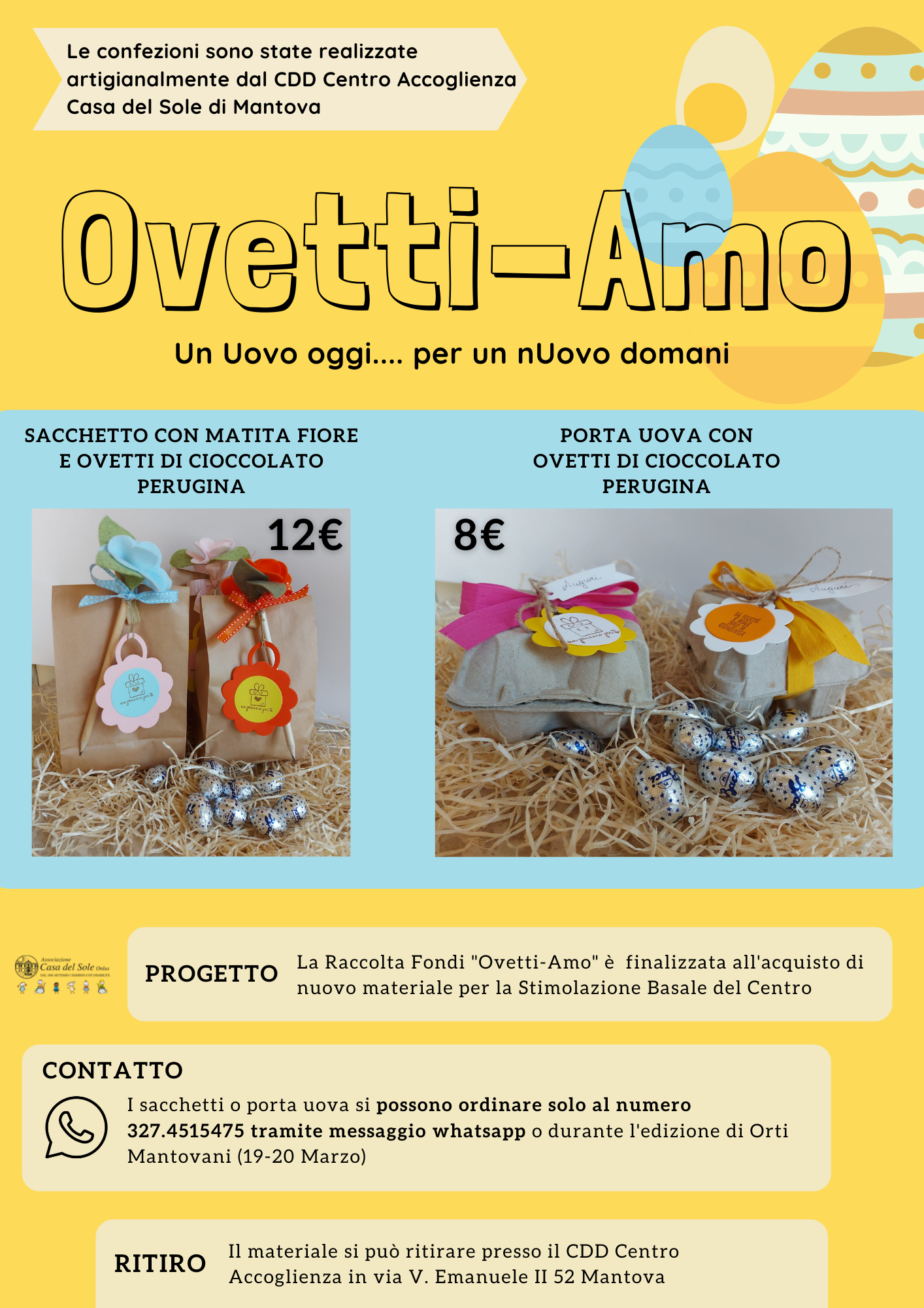 SAN SILVESTRO (Curtatone) – E’ partita la nuova campagna di raccolta fondi “Ovetti-Amo, un uovo oggi…per un nUovo domani”. La raccolta fondi organizzata e gestita dal Cdd, Centro Accoglienza Casa del Sole, prevede la vendita di sacchetti con matita e portauova con all’interno ovetti di cioccolato ed è finalizzata all’acquisto di nuovo materiale per la Stimolazione Basale del Centro di Mantova. Le confezioni e le matite sono state realizzate artigianalmente dai ragazzi e gli operatori del Centro e gli ovetti presenti sono stati donati dalla Perugina (stabilimento di San Sisto, Perugia).