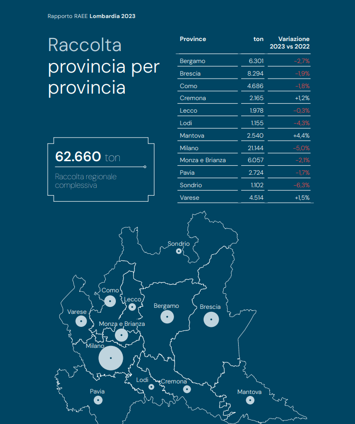 Entrando più in dettaglio il report evidenzia come la raccolta pro capite più elevata nel 2023 sia stata registrata ancora una volta dalla provincia di Como con 7,88 kg/ab (-1,7%). Il dato è determinato in particolare dalla raccolta di lavatrici e grandi bianchi (lavastoviglie, apparecchi per la cottura e simili). Per questa tipologia di RAEE il risultato registrato è stato superiore di oltre 1 kg (+57,3%) alla media nazionale (2,07 kg/ab).