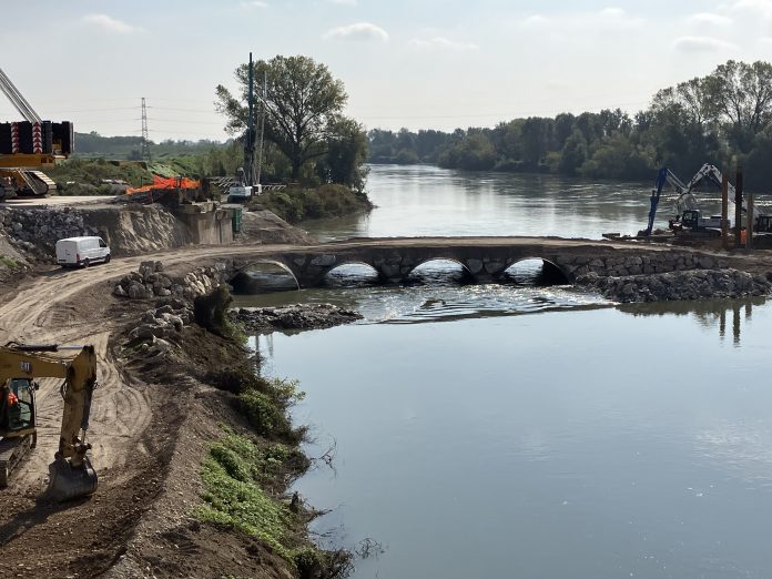 Il guado, cioè un terrapieno che incorpora quattro grandi tubi di un diametro di 5 metri e lunghi più di 15, che permettono il deflusso dell’acqua del fiume, servirà a raggiungere l’isola su cui sarà costruita la pila centrale, consentendo quindi le lavorazioni previste dal progetto.