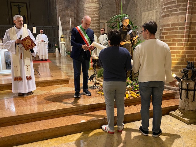 Prima della conclusione della celebrazione si è rinnovato uno dei momenti più attesi e simbolici: la donazione del cero da parte del Comune di Mantova alla comunità francescana. Quest’anno è stato il presidente del Consiglio comunale, Massimo Allegretti, a consegnare il cero alla comunità francescana guidata da frate Fabio Piasentin, guardiano della fraternità dei Frati Minori. “Offro questo cero a San Francesco – ha affermato Allegretti – per la protezione della città e della popolazione che la abita”. Dopo la benedizione, Allegretti ha acceso il cero votivo, suggellando così un rito che affonda le sue radici nella storia della città. La tradizione della donazione del cero risale infatti all’epoca dei Gonzaga, che scelsero la chiesa di San Francesco come mausoleo dal Trecento fino alla fine del Quattrocento, e il Santo come protettore della città.