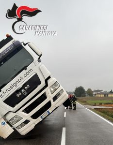Sul posto i vigili del fuoco di Suzzara e Mantova che con l’aiuto di una gru hanno messo in sicurezza il camion e i carabinieri per i rilievi.