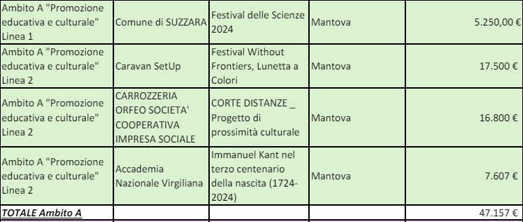 La finalità dell’Avviso Unico Cultura 2024, con una dotazione finanziaria complessiva di 5.661.000 euro, è, in concreto, quella di sostenere progetti e iniziative finalizzati alla promozione culturale a 360 gradi, anche dal punto di vista formativo ed educativo, nonché alla valorizzazione degli istituti e luoghi della cultura (Biblioteche e archivi storici, Musei, Riconoscimenti Unesco e aree e parchi archeologici non statali, Patrimonio immateriale, Itinerari culturali, cammini e patrimonio culturale diffuso), alla promozione dello spettacolo dal vivo e del cinema e ai soggetti partecipati da Regione Lombardia. Per il Mantovano i progetti finanziati riguardano la promozione educativa e culturale (4 per 47.157 euro), altri 15 per “Musei, Biblioteche ed archivi storici, Riconoscimenti UNESCO e Aree e Parchi archeologici non statali” per un totale di 252.816.03 euro e 6 per la promozione dello spettacolo dal vivo e del cinema (103.000 euro).