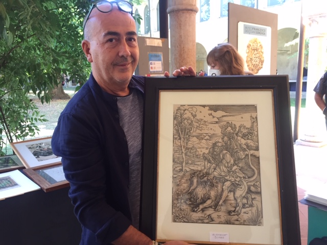 I pezzi rari, molti dei quali antichi, e le curiosità erano comunque davvero tanti tra i banchi al Diocesano e siamo andati a scoprirli insieme all’organizzatrice della manifestazione Elisabetta Casanova che si dichiara ovviamente soddisfatta del successo di visitatori registrato in un solo giorno e mezzo di esposizione. Come l’incisione a bulino di Andrea Mantegna realizzata proprio a Mantova nella seconda metà del XV° secolo dal titolo “La sepoltura” o la xilografia risalente sempre allo stesso periodo di Abrecht Durer raffigurante “Sansone che uccide il Leone”. In questo caso le due preziosissime opere si potevano ammirare sul banco di Fabrizio Pizzaglia di Urbino.