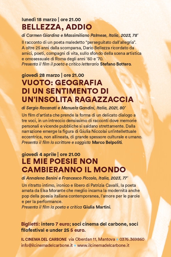MANTOVA – Si chiama “Cinepoetiche Visioni” è il nuovo ciclo di appuntamenti del Cinema del Carbone che prevede documentari “in versi” su tre protagonisti della poesia italiana tra fine Novecento e inizio Duemila.