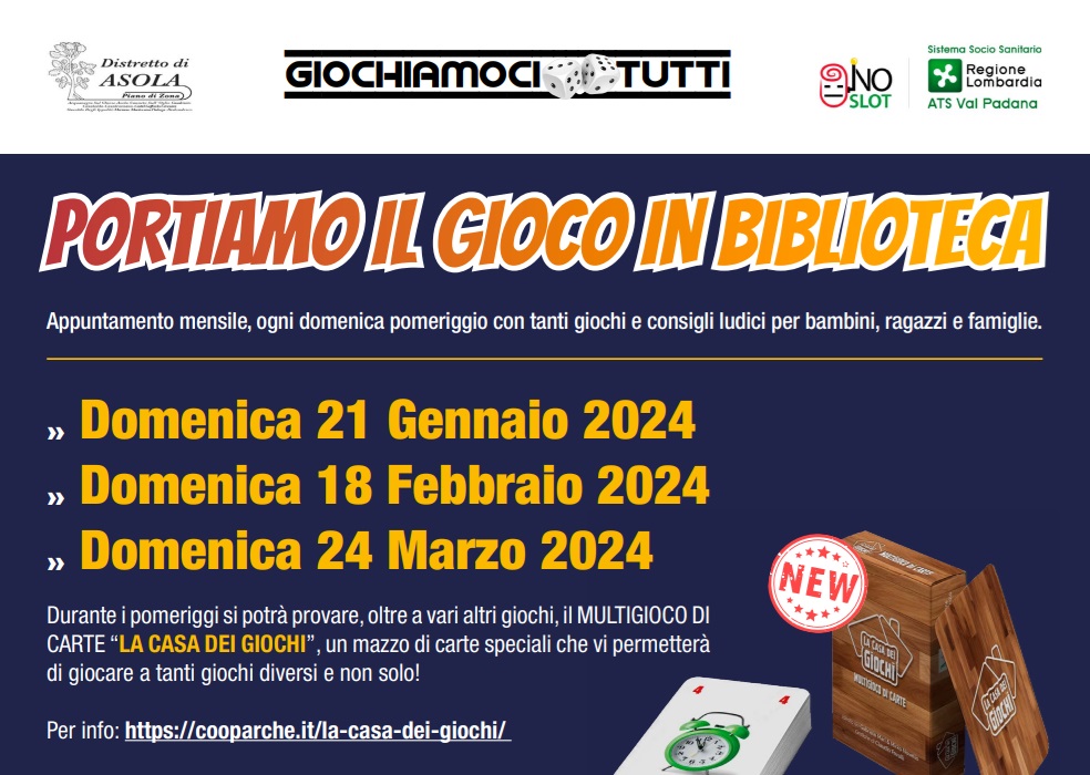 L’invito quindi è quello di andare a giocare la domenica dalle 15.30 alle 17.30, presso la Biblioteca comunale “A. Torresano” in Via Ziacchi ad Asola (MN).