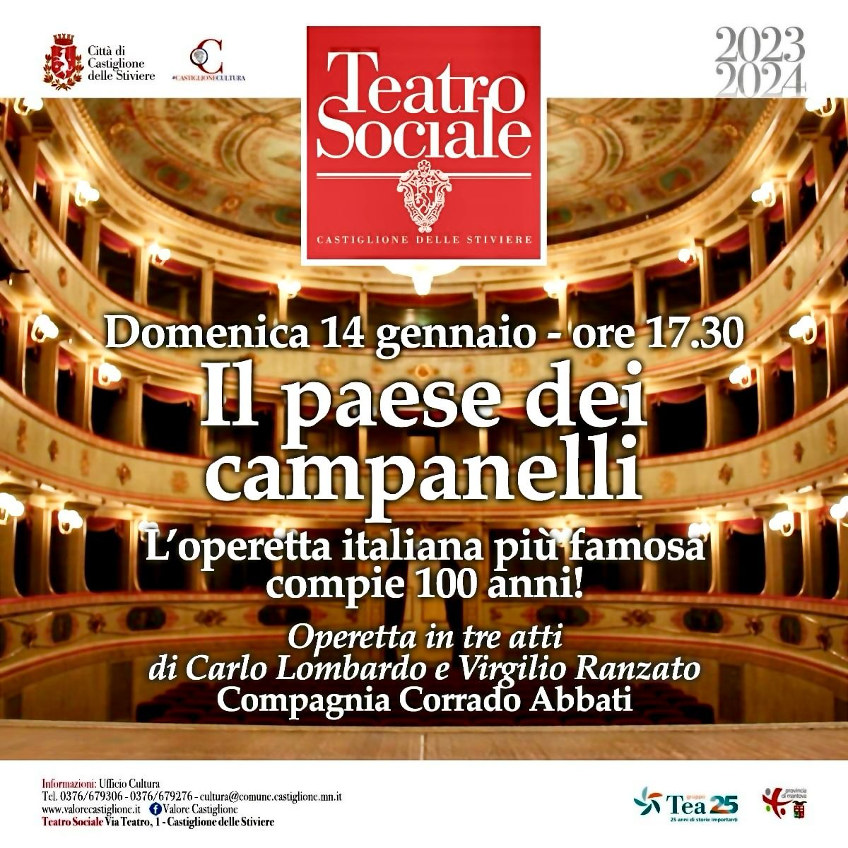 L’appuntamento per celebrare questa importante ricorrenza è domenica alle 17.30 al Teatro Sociale di Castiglione. Tre atti di Carlo Lombardo e Virgilio Ranzato interpretata dalla compagnia di Corrado Abbati. è orecchiabile, semplice, di impatto immediato e conquista tutti, anche le persone non abituate ad andare all’opera.