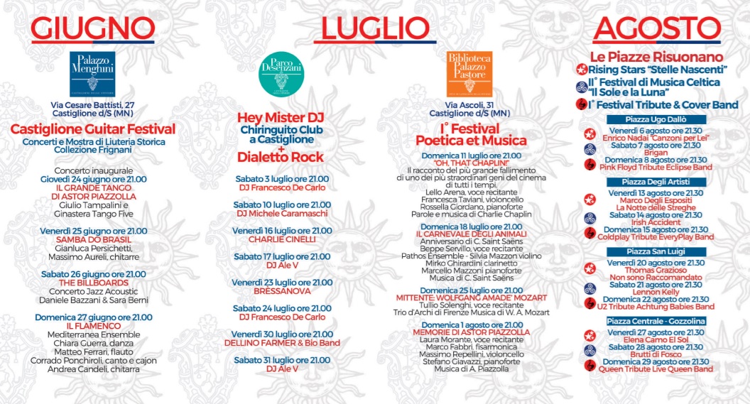 L’intero cartellone delle manifestazioni estive si compone di sette diverse rassegne, raggruppate per generi ed associate ai diversi spazi della città, privilegiando le piazze, i parchi e i cortili dei palazzi storici. A Palazzo Menghini, già sede della Galleria di arte moderna e contemporanea, il prossimo 24 giugno esordirà “Castiglione Guitar Festival”, con quattro concerti e la mostra di Liuteria Storica della Collezione Frignani. Parco Desenzani ospiterà “Hey Mister DJ” e “Dialetto Rock”, mentre a Palazzo Pastore sarà allestito il “I° Festival Poetica et Musica”, con la partecipazione di artisti quali Lello Arena, Beppe Servillo, Tullio Solenghi e Laura Morante. Nel mese di agosto si accenderanno i riflettori nelle piazze della città aloisiana: la rassegna itinerante prevede “Rising Stars”, “II° Festival di Musica Celtica” e “I° Festival Tribute & Cover Band”.
