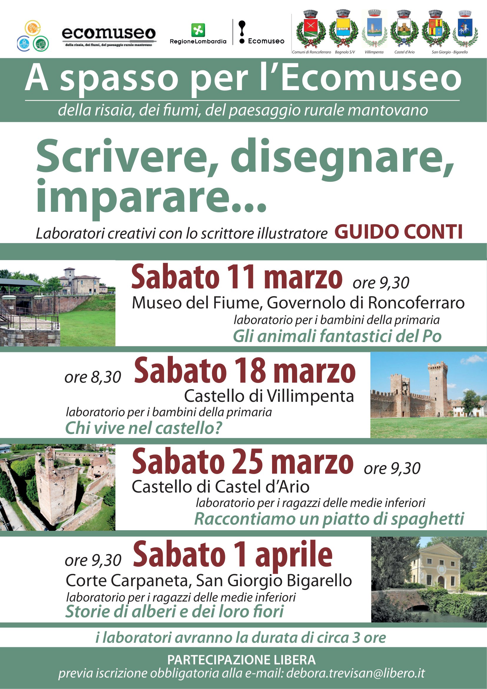 PROVINCIA – Quattro laboratori creativi per “Scrivere, disegnare, imparare”, quattro appuntamenti dedicati a bambini e ragazzi, a cura dell’Ecomuseo della risaia, dei fiumi, del paesaggio rurale mantovano, che per quattro sabati consecutivi in quattro location diverse vedranno impegnati i piccoli avventori con i laboratori creativi a cura dello scrittore e illustratore Guido Conti.