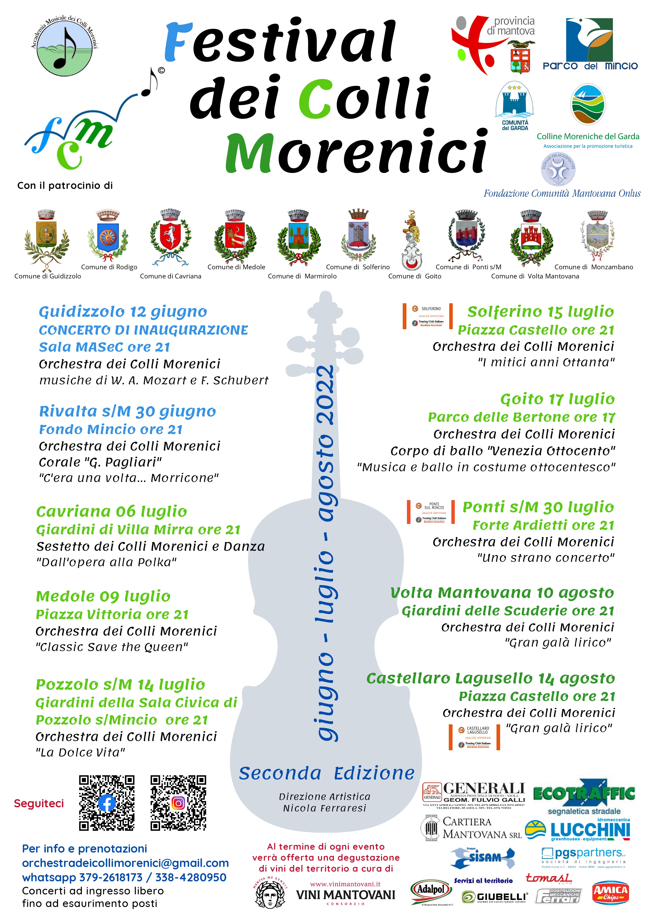 Il primo appuntamento si terrà il 12 giugno a Guidizzolo presso la sala MASeC (ore 21:00) con il concerto inaugurale eseguito dall’Orchestra dei Colli Morenici con un programma di musiche di W. A. Mozart e F. Schubert, per poi proseguire fino al 14 agosto toccando complessivamente 10 comuni mantovani.