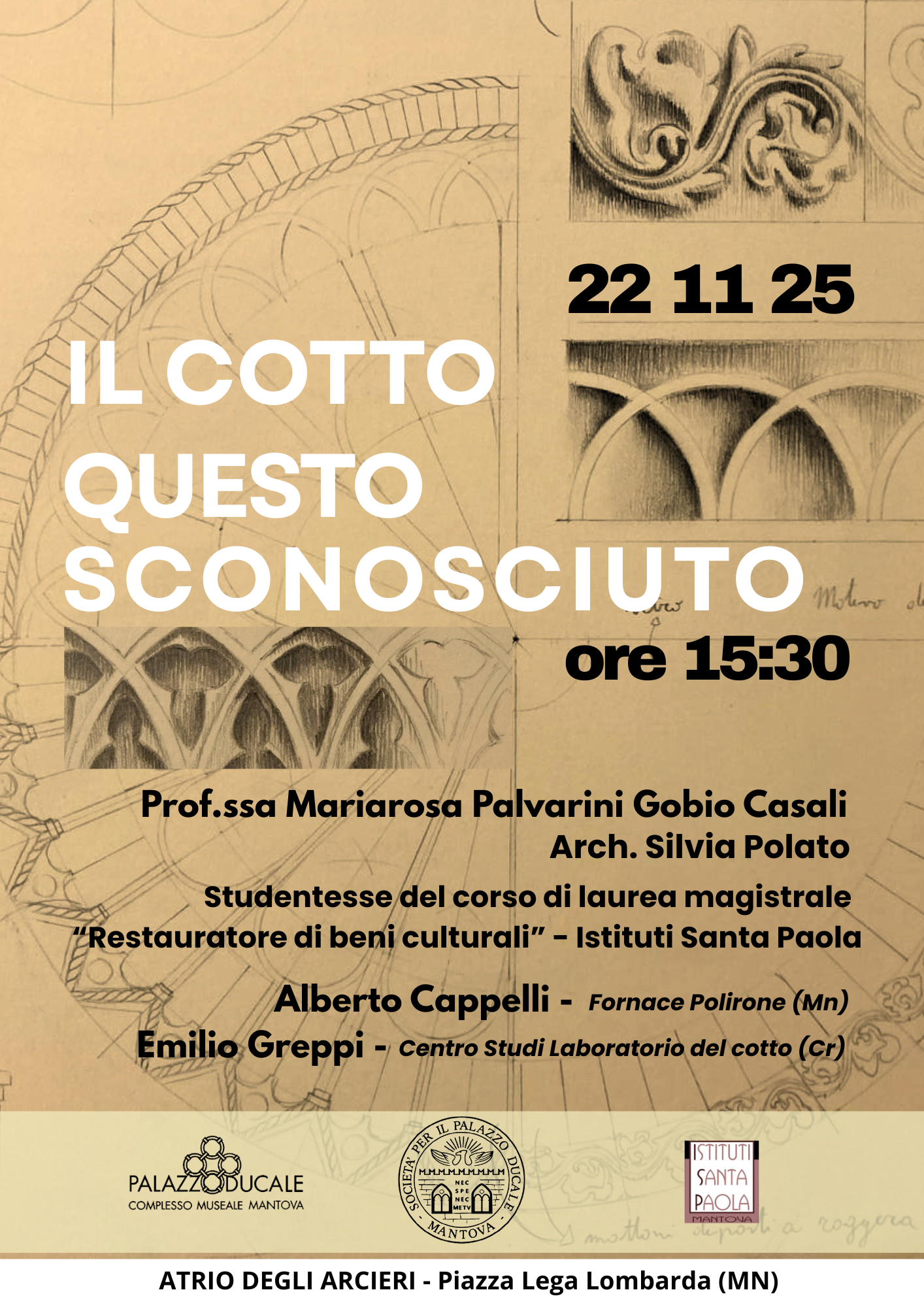 MANTOVA – “Il cotto, questo sconosciuto” è il titolo dell’incontro organizzato da La Società per il Palazzo Ducale di Mantova in programma sabato 22 novembre alle ore 15.30 nell’Atrio degli Arcieri. Un pomeriggio dedicato alla riscoperta di un sapere antico, che per secoli ha modellato il paesaggio e l’economia del territorio mantovano.