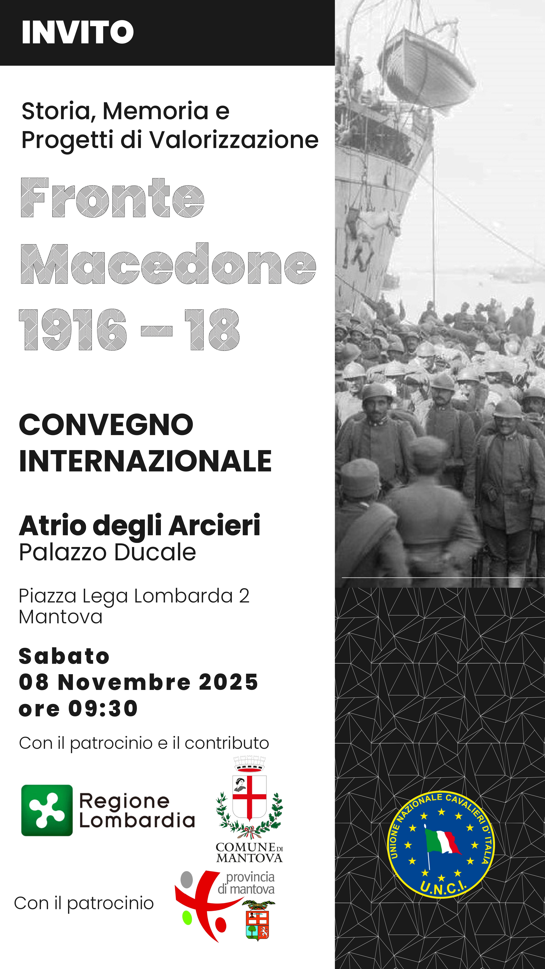 L’evento, organizzato da Unci di Mantova con il contributo e patrocino di Regione Lombardia e Comune di Mantova e patrocinio della Provincia, vedrà la partecipazione di personalità di primo piano: Sen. Manfredi Potenti, presidente dell’Intergruppo Parlamentare “Sentieri della Memoria”, Silvano Gallon, già Console d’Italia a Skopje, Elias Spyridonidis, Università Aristotele di Salonicco, Eric Allart, Associazione Normandia-Dardanelli, Kristian Dzambazovski, consulente del Ministro della Cultura della Macedonia del Nord e Margareta Spasov, direttrice Istituto Nazionale e Museo di Bitola.