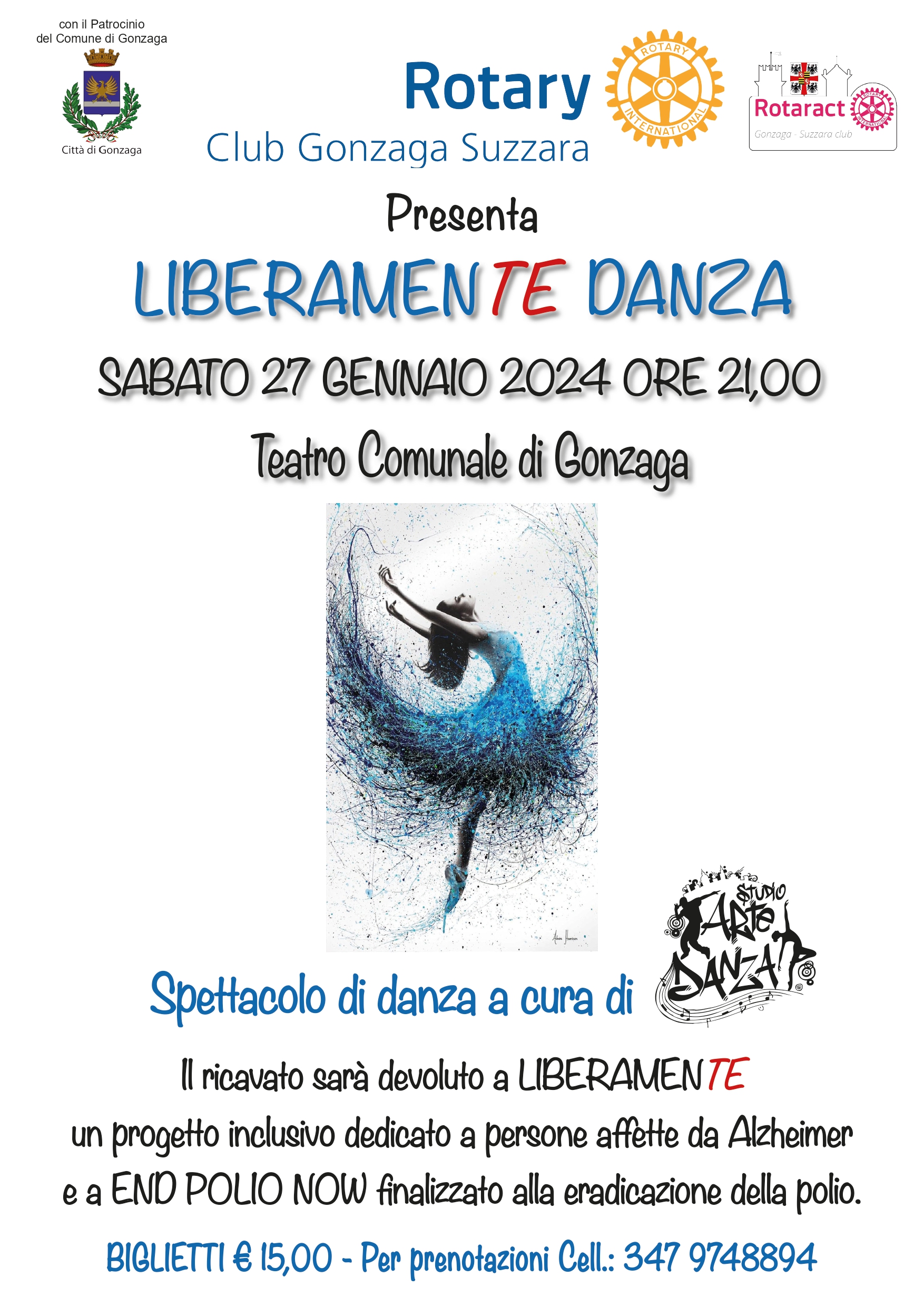 GONZAGA – Si chiama “Liberamente Danza”, è uno spettacolo a scopo benefico curato da Studio Arte Danza di Silvia Calabria, organizzato dal Rotary Club Gonzaga Suzzara che si terrà al Teatro comunale di Gonzaga  sabato 27 gennaio alle ore 21.