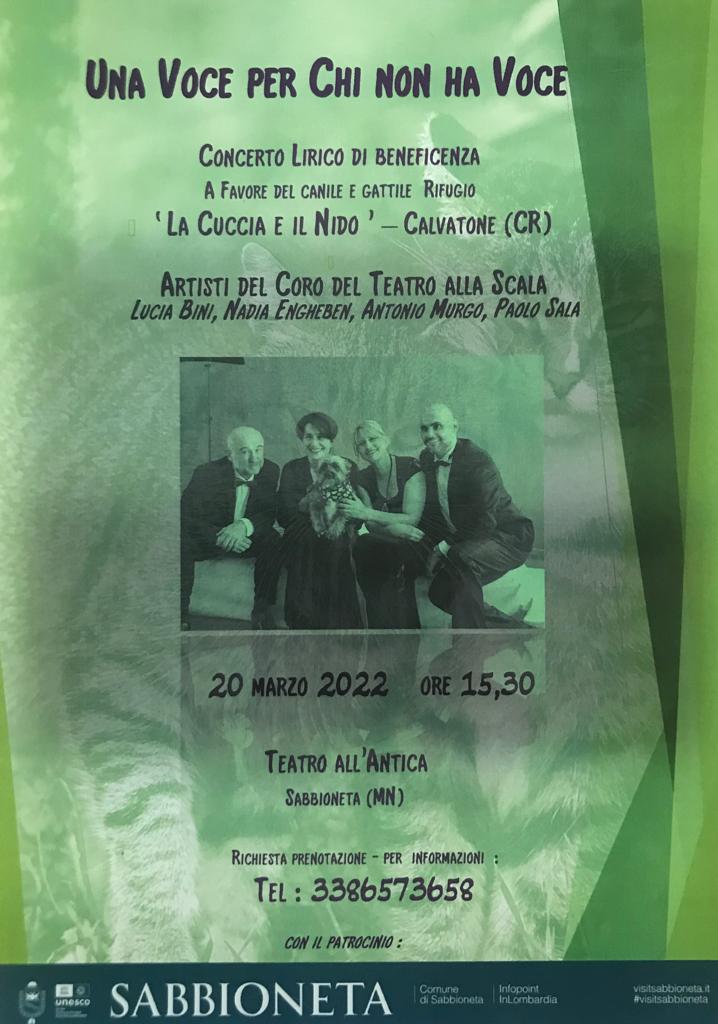 Inoltre rappresenta l’inizio della primavera sperando che sia di buon auspicio per la fine della guerra in Ucraina e la fine della pandemia Covid, eventi che stanno devastando il mondo intero. Gli artisti, molto sensibili alle problematiche degli animali e a chi li assiste, si esibiranno nel magnifico Teatro all’Antica voluto dal duca Vespasiano Gonzaga e terminato nel 1590. I cantanti lirici , tutti di alto livello artistico e comprovata esperienza solistica, si si esibiscano a titolo puramente gratuito, mostrando una enorme sensibilità al fine benefico dell’evento.