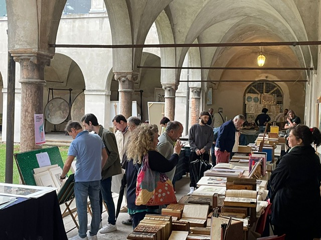 MANTOVA – Il chiostro del Museo Diocesano è andato riempendosi di gente non appena ha cessato di piovere ma c’è anche chi non si è lasciato intimorire dalla pioggia e già questa mattina era a curiosare tra i banchi di “Mantova Libri Mappe Stampe”, la prima mostra mercato di antiquariato librario e collezionismo cartaceo in Italia, che ha già registrato un grande successo di visitatori in questa prima giornata e che si prepara a bissarlo domani, confidando anche in un meteo più clemente.