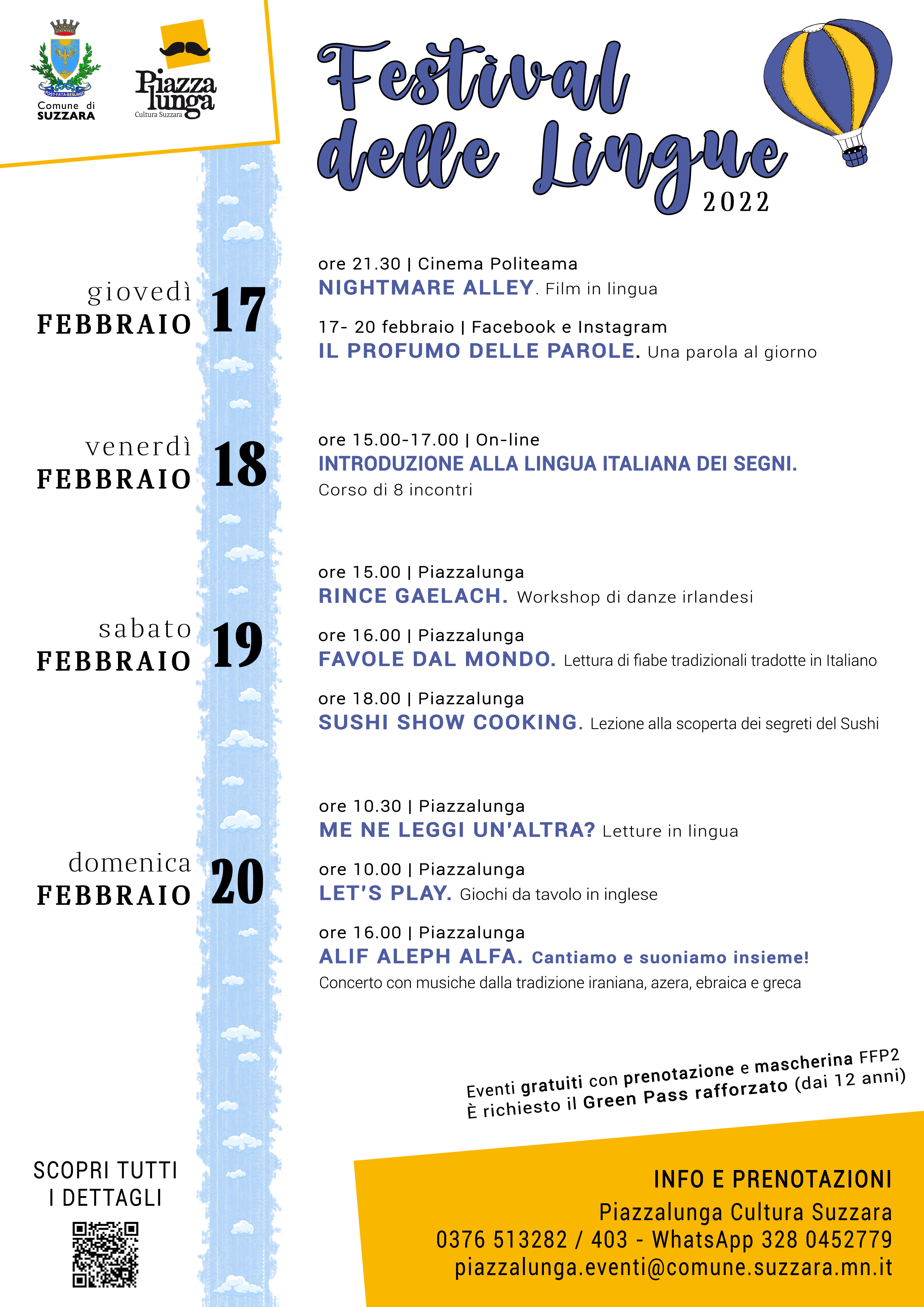 SUZZARA – Torna dal 17 al 20 febbraio al Centro Culturale Piazzalunga il Festival delle Lingue, giunto alla IX edizione. In occasione della Giornata Internazionale della Lingua Madre (21 febbraio), il Piazzalunga si trasforma in “una babele felice” in cui varie lingue e culture si incontrano e si raccontano.