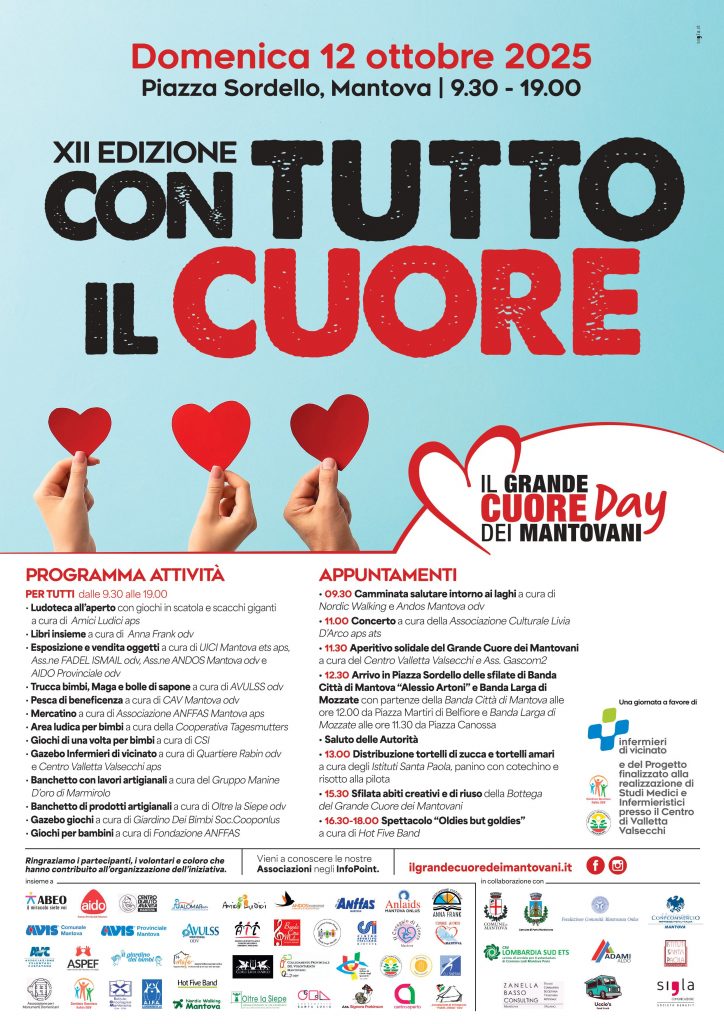 MANTOVA – Più di 40 associazioni di volontariato del territorio riunite in un unico luogo all’aperto nel centro della città, piazza Sordello, allo scopo di raccogliere fondi per contribuire al benessere della comunità tutta. Anche quest’anno, domenica 12 ottobre, ritorna la 12esima edizione de “Il Grande Cuore dei Mantovani”, evento unico nel suo genere che si avvale della collaborazione di Fondazione Comunità Mantovana, Csv Lombardia Polo Sud privati, Confcommercio Mantova, Enti pubblici, aziende, scuole e – ovviamente – tante associazioni di volontariato.