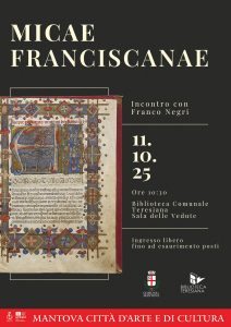 MANTOVA – Sabato 11 ottobre alle ore 10.30, nella Sala delle Vedute della Biblioteca Comunale Teresiana di Mantova, si terrà un incontro con il professor Franco Negri dedicato alla figura di San Francesco d’Assisi, nell’ambito dell’Ottavo Centenario francescano (2023-2026).