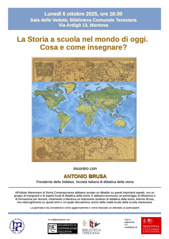 MANTOVA – “La Storia a scuola nel mondo di oggi. Cosa e come insegnare?“: questo il titolo dell’ incontro con Antonio Brusa, Presidente della Società italiana di Didattica della Storia, che si terrà alla Biblioteca Comunale Teresiana il 6 ottobre alle 16:30 nella Sala delle Vedute in via Ardigò 13.