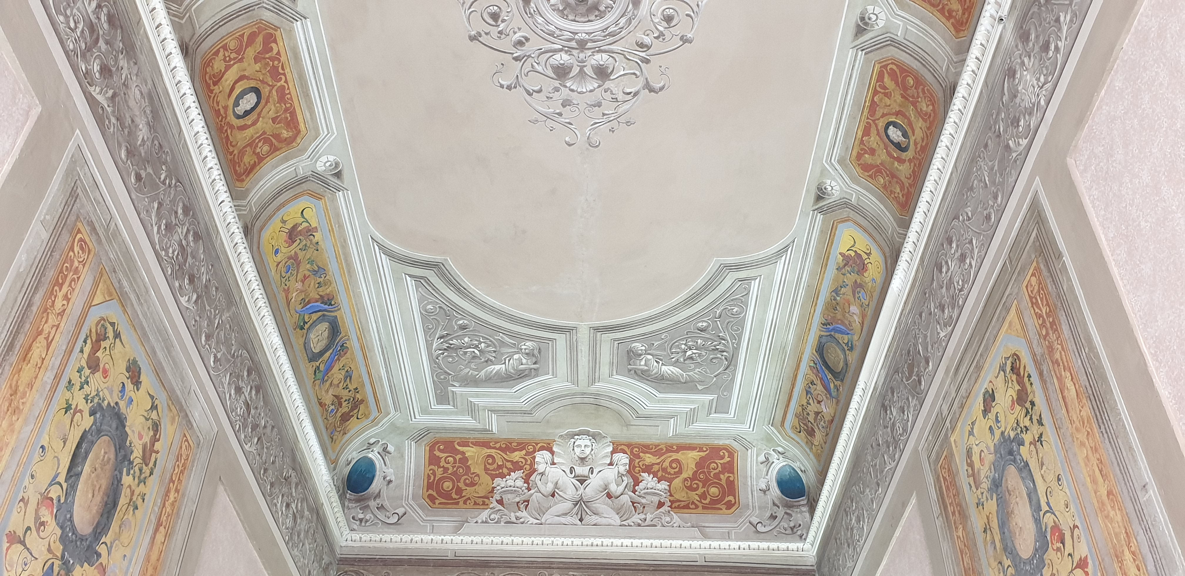 Affreschi con soggetti mitologici, decorazioni in stucco, dorature e medaglioni con divinità olimpiche, decorazioni risalenti al tardo Cinquecento, con tracce di paesaggi e storie all’interno di cornici.
